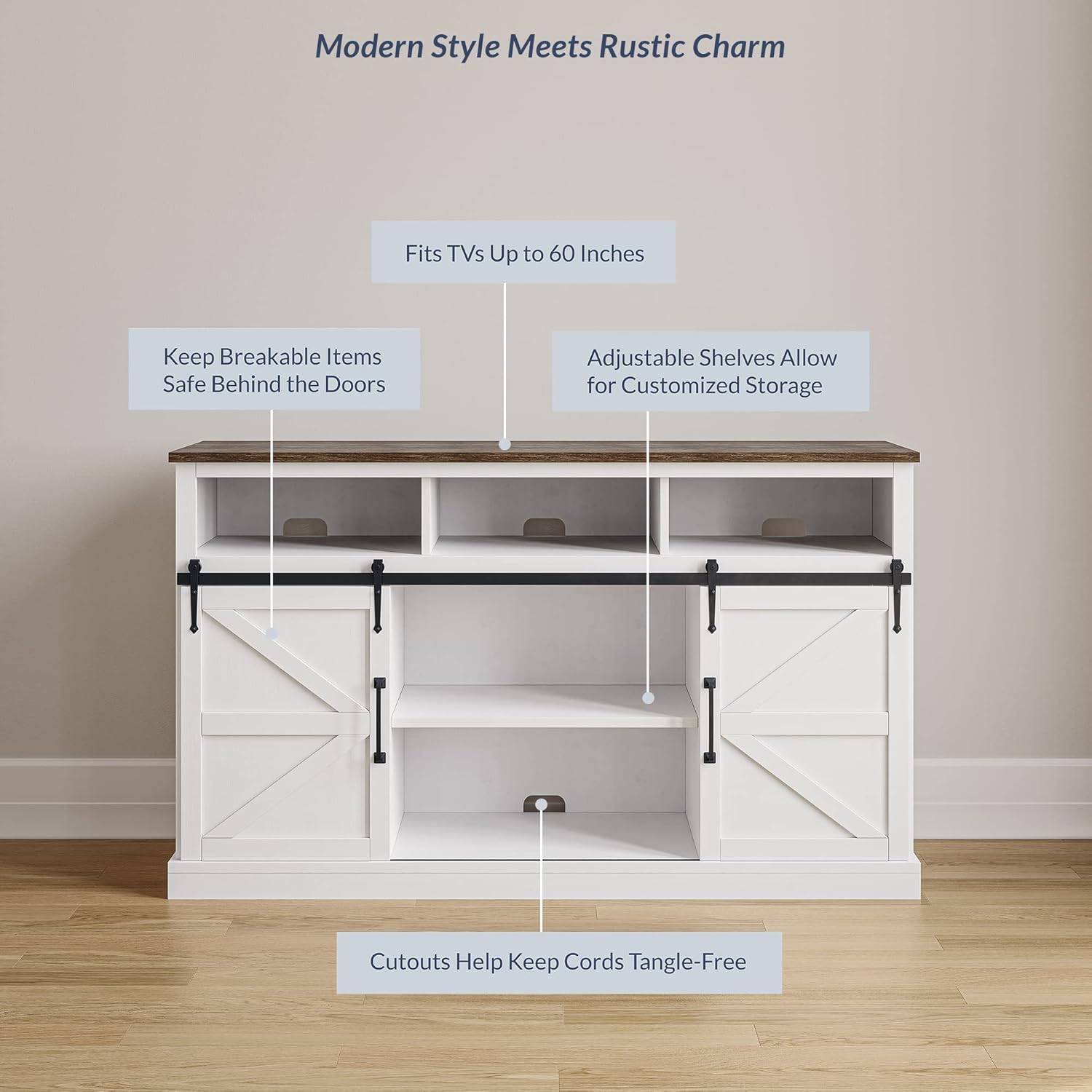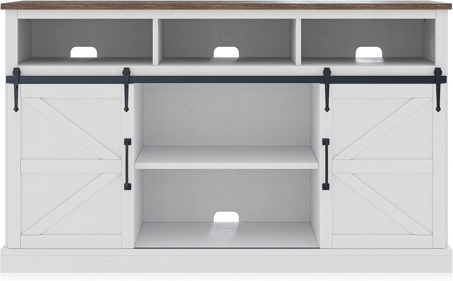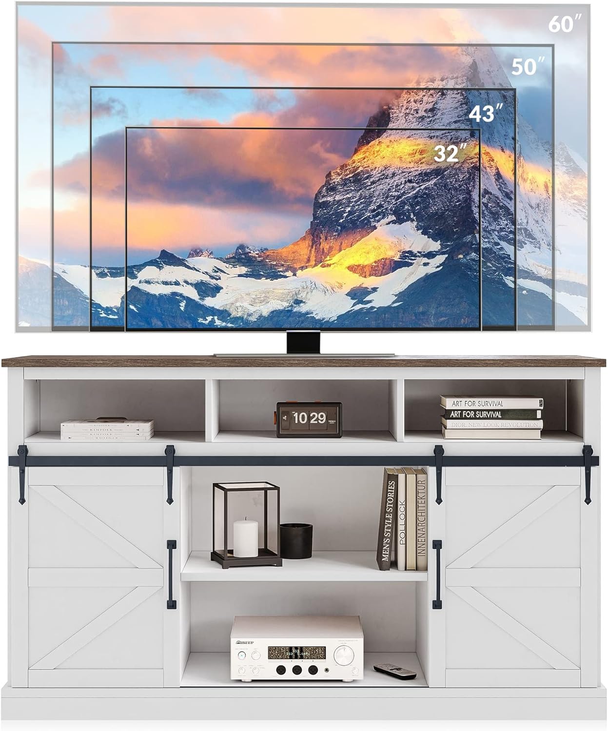 [FARMHOUSE WOOD TV STAND] This wood TV storage cabinet features sliding barn-style doors for a rustic farmhouse style, while the dual white and wood tone introduces a modern appeal that's perfect for a variety of decor styles.