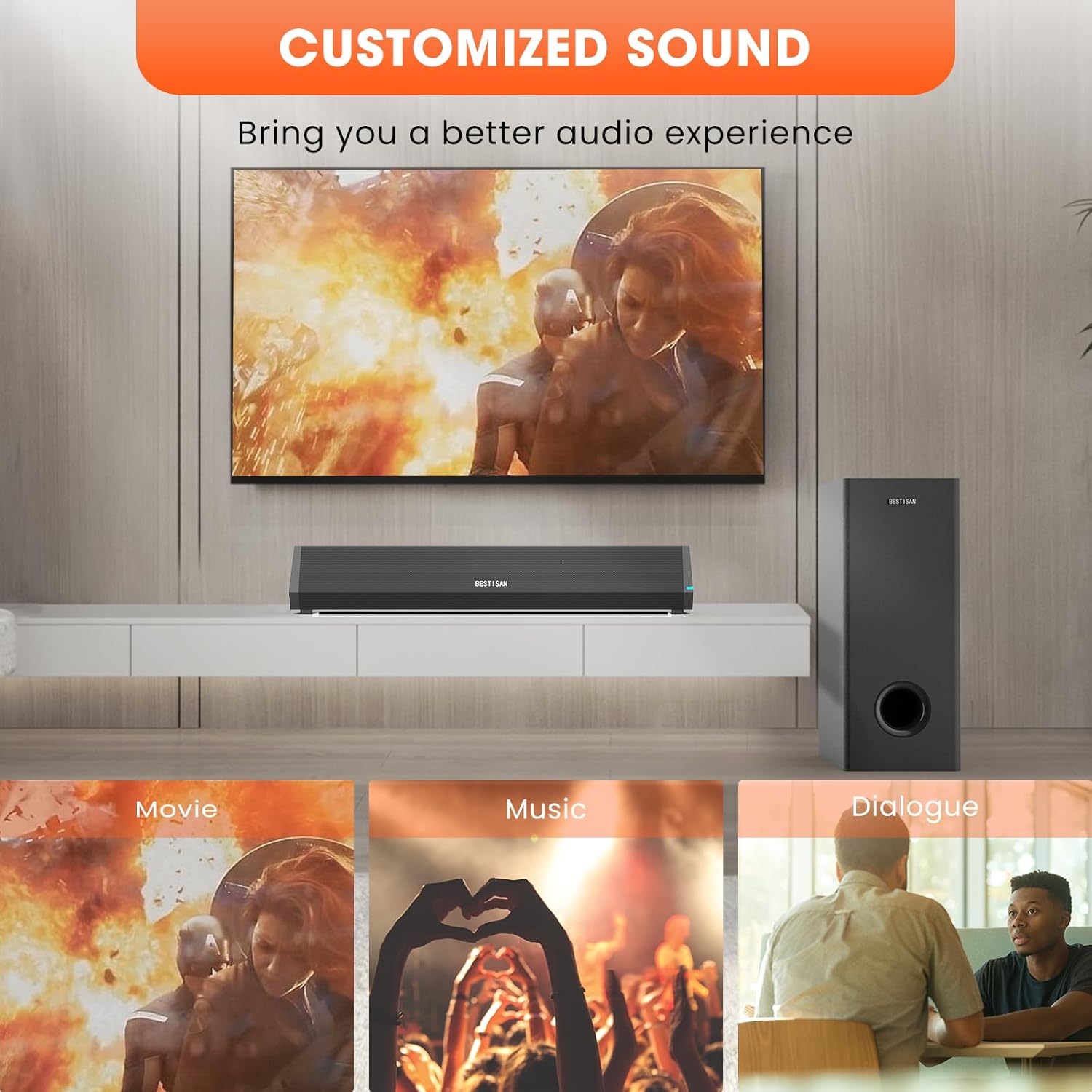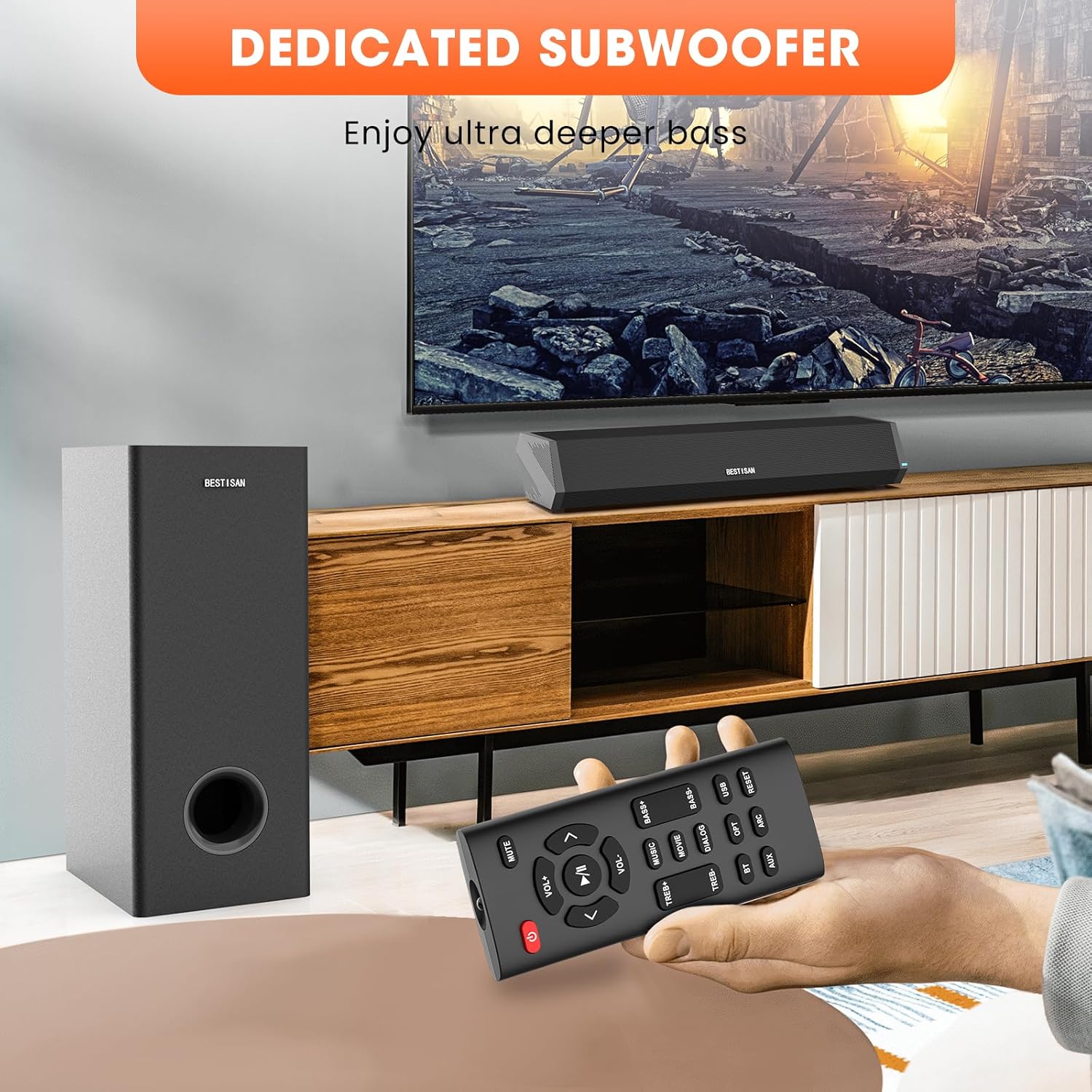 【Professionally Tuned EQ Modes】: To suit different audio needs, BESTISAN SE07D sound bar features a variety of preset EQ modes including Dialogue, Movie, and Music, creating individual sound curves suitable for the type of content to enhance sound quality and improve your viewing experience. In addition, we provide a replacement remote control for free. (The remote control is not compatible with universal or TV remote controls)