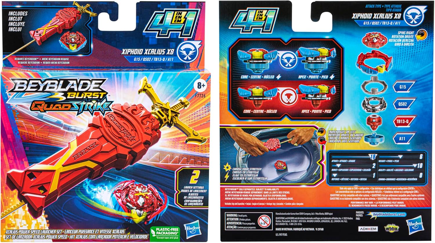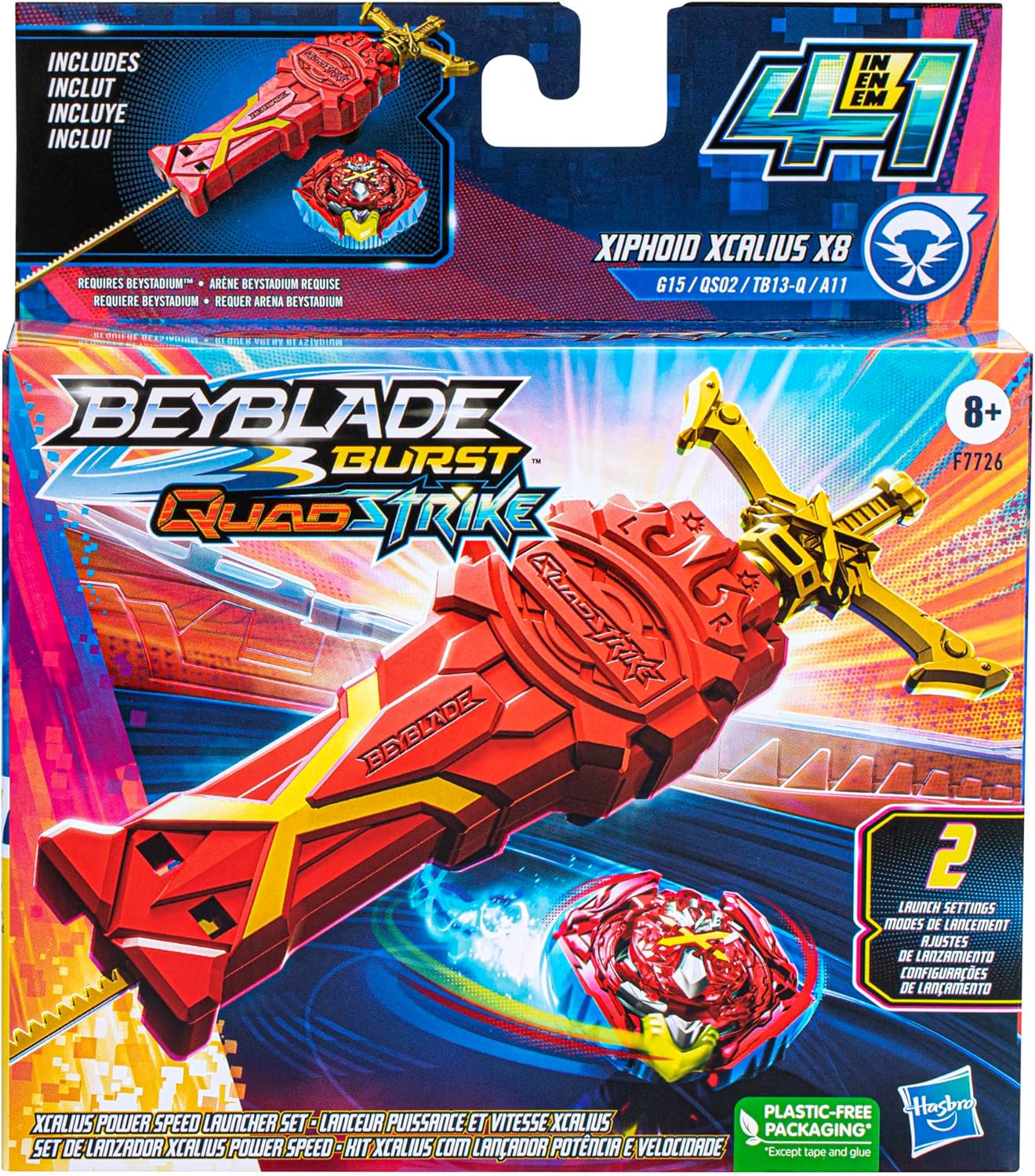 Beyblade Burst QuadStrike Xcalius Power Speed Launcher Pack launches you into the next stage of Beyblade battle with top and launcher toy sets for boys and girls ages 8 and up. QuadStrike uppers are enhanced with enhanced armor spikes designed to defeat opponents with more intense engagements. Configure the top in 4 different ways to have 4 ways to strategize and customize, 4 battle modes, and 4 ways to win! The Xcalius Power Speed Launcher Bundle includes 1 Xcalius Power Speed Launcher and 1 right-spin top: Xiphoid Xcalius X8 G15 QS02 TB13-Q A11. Xcalius Power Speed Launcher features 2 launch settings: power or speed. Choose your option to maximize battle strategy! Power mode sends the top into a supercharged battle, while Speed mode intensifies the top's rotation. Customize the top to Core and Apex mode for balance type or Core+ and Apex+ mode for attack type. Unleash the power of QuadStrike technology in the QuadStrike Beystadium (Beystadium required. Sold separately, subject to availability). Hasbro and all related terms are trademarks of Hasbro, Inc.