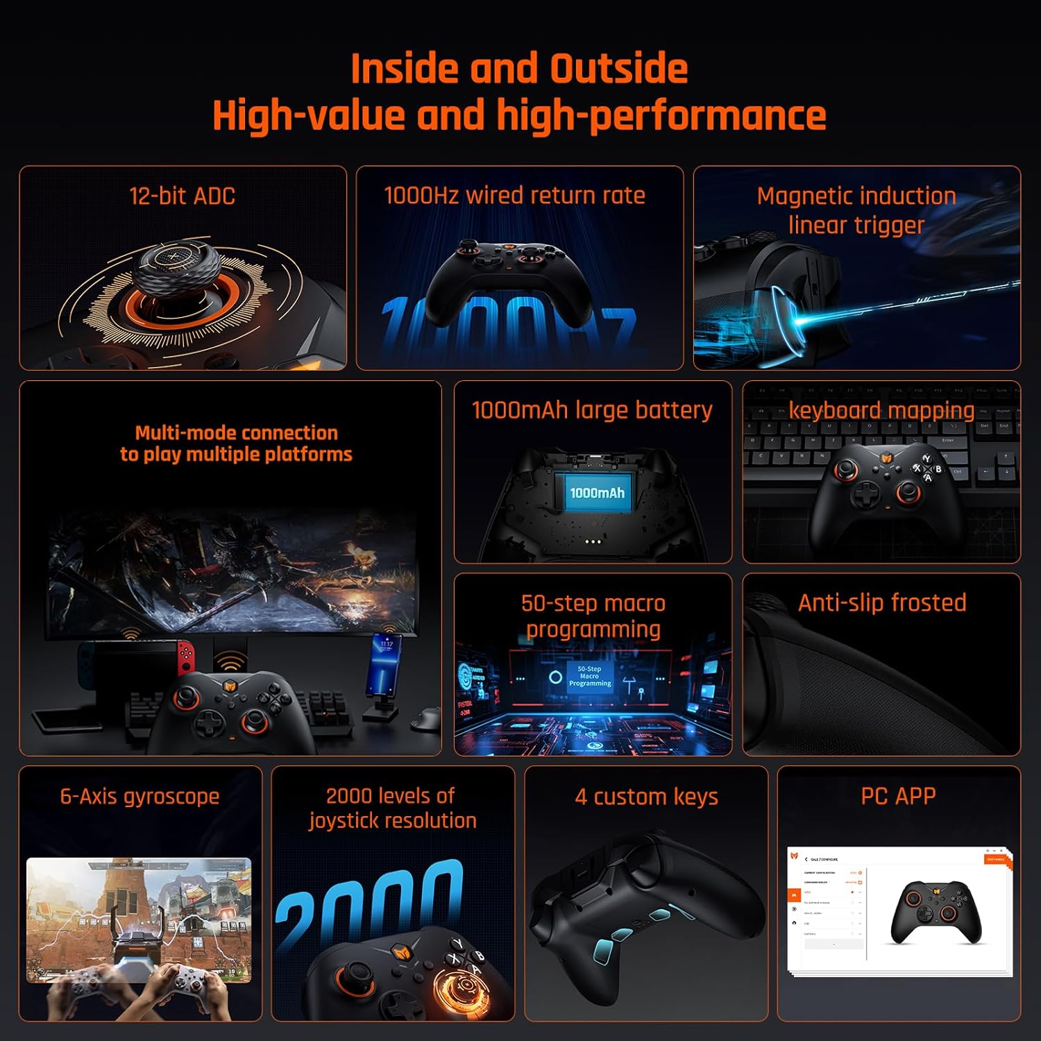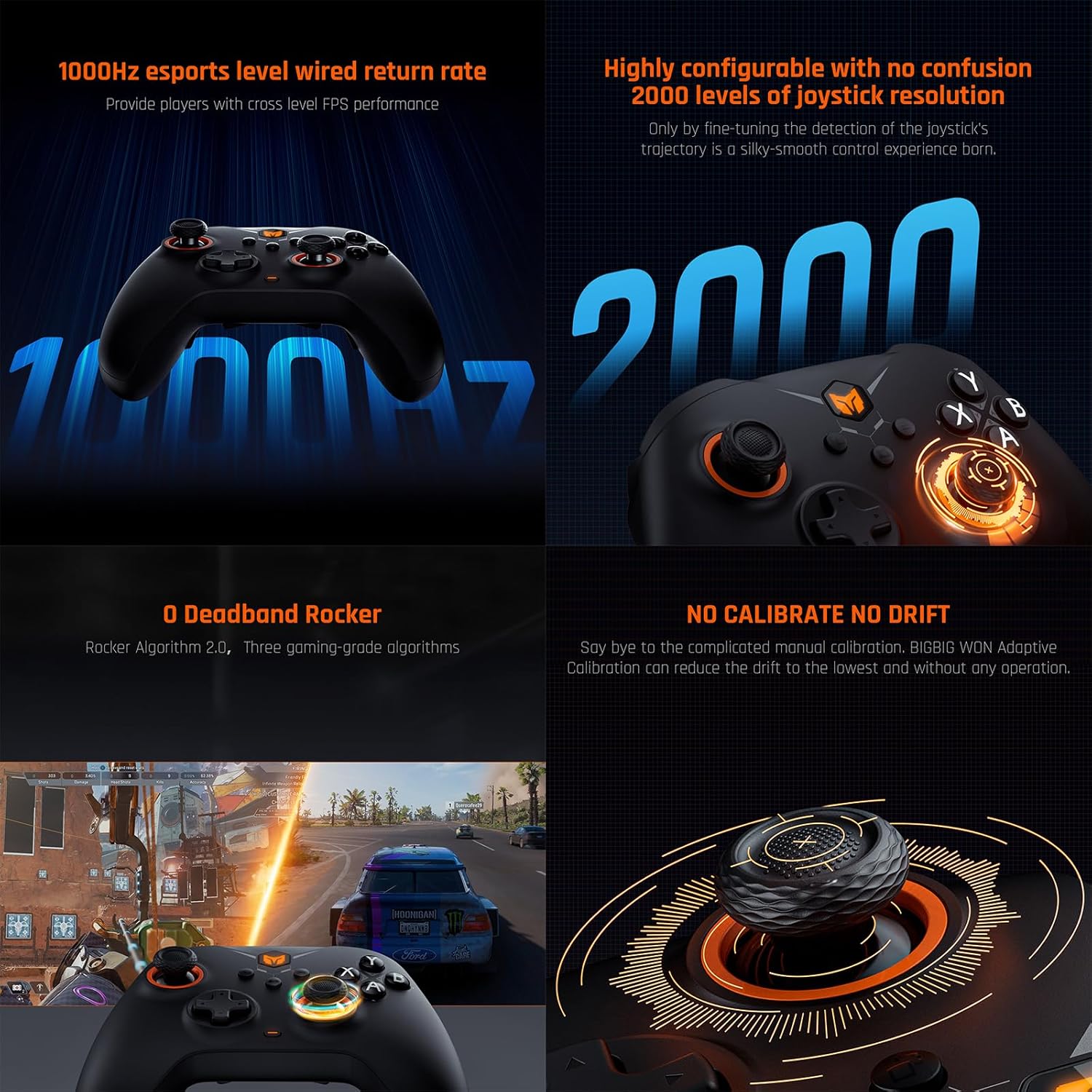 【Hall Effect Trigger】Highly accurate trigger of hall effect controller is perfect for all gaming, linear trigger for the racing game, hair trigger(software) for the FPS. 【FPS E-sports Controller Configuration】1000 Hz e-sports level return rate for wired, 125 Hz return rate for wireless.【12-bit ADC & 2000-level Axis-Resolution】The smoother aiming comes from the higher axis-resolution. 【0 Deadzone】FPS algorithm 2.0 accurate aiming miraculous moving.