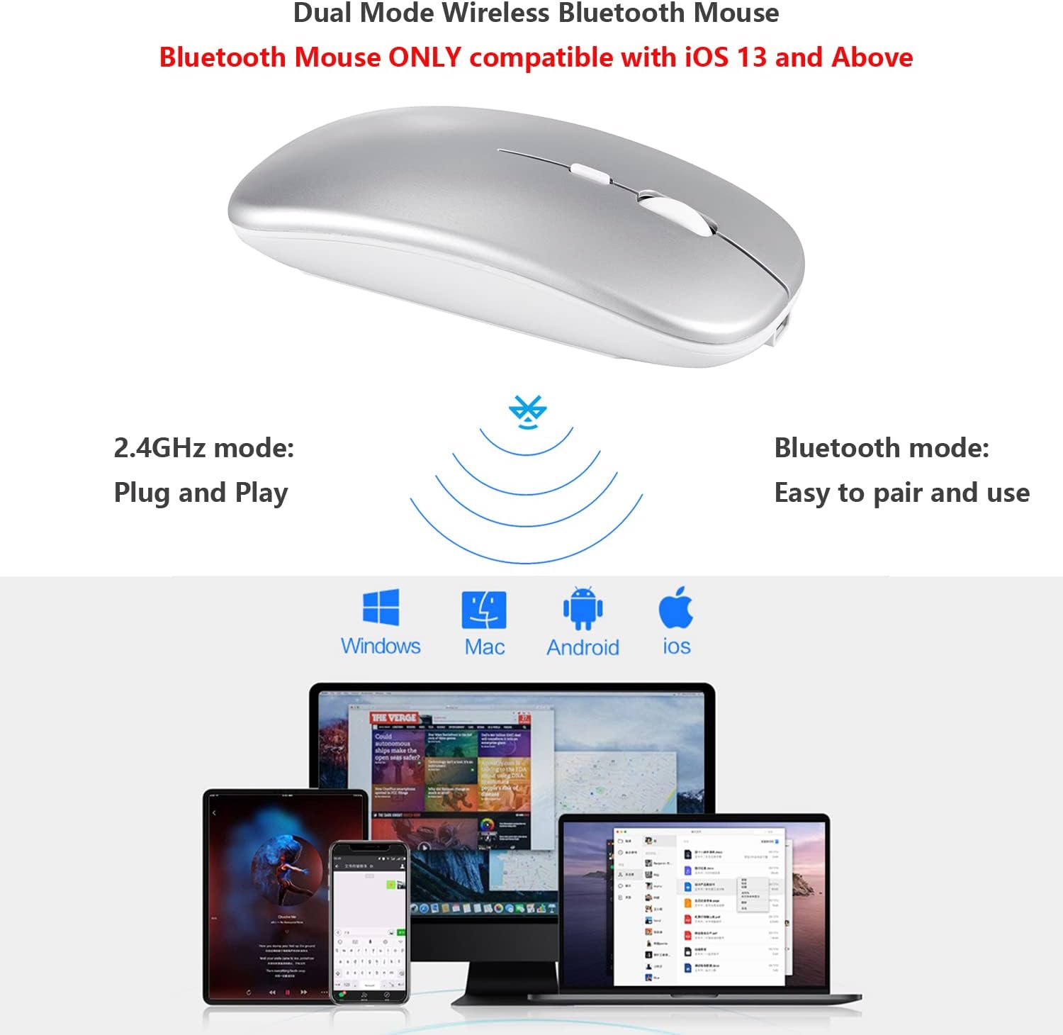 Excellent compatibility: the mouse compatible with the Android and Windows iOS macOS system. It is perfect for the laptop Surface PC Desktop Chromebook, Android Samsung Tablet Smartphone Cell phone, iPhone iPad, iPad Mini, iPad Pro, iPad Air, MacBook Pro Air Mac IMAC Multiple devices. You must update the iPad and iPhone system to iOS 13 or up, and turn on the configuration> accessibility> touch> assistance touch】