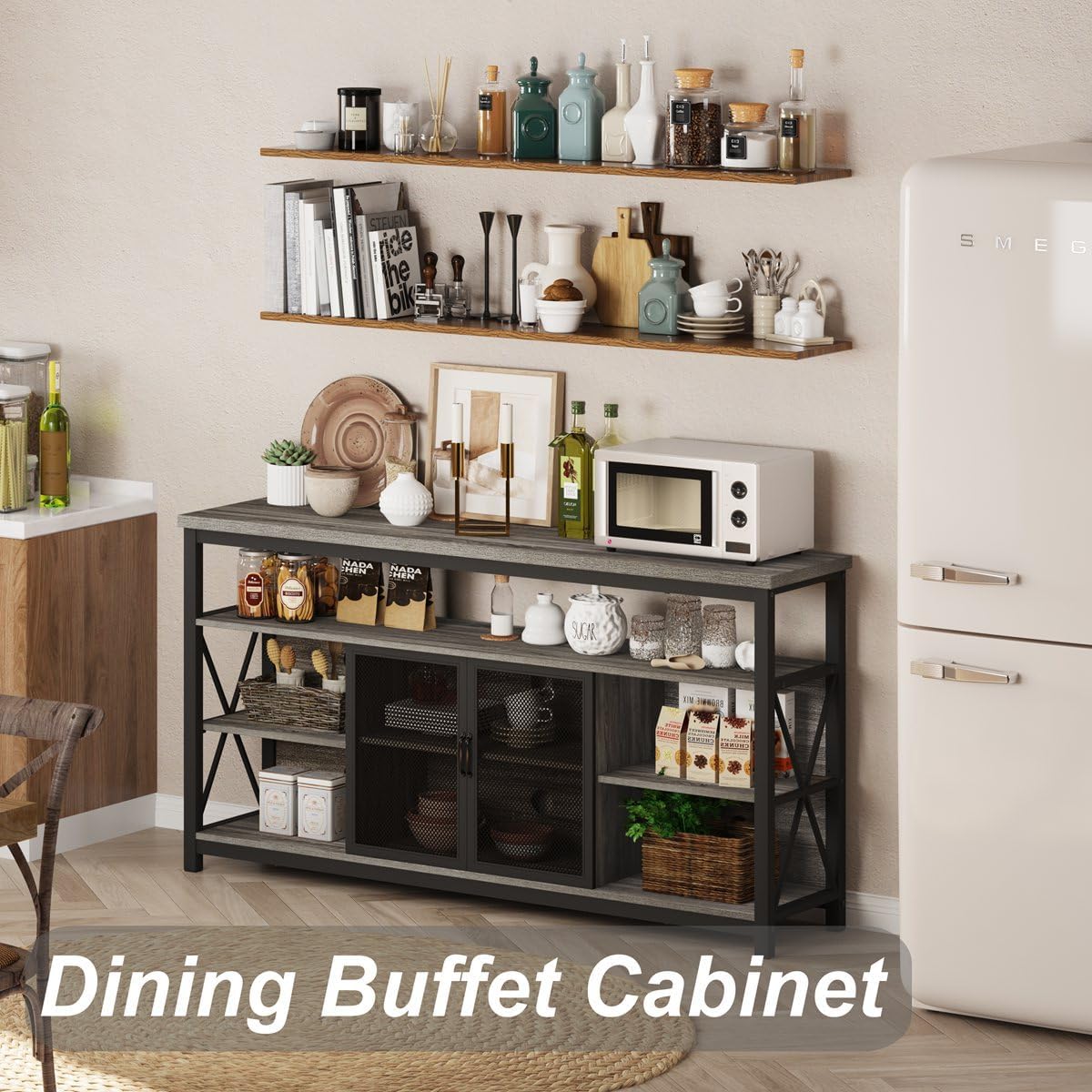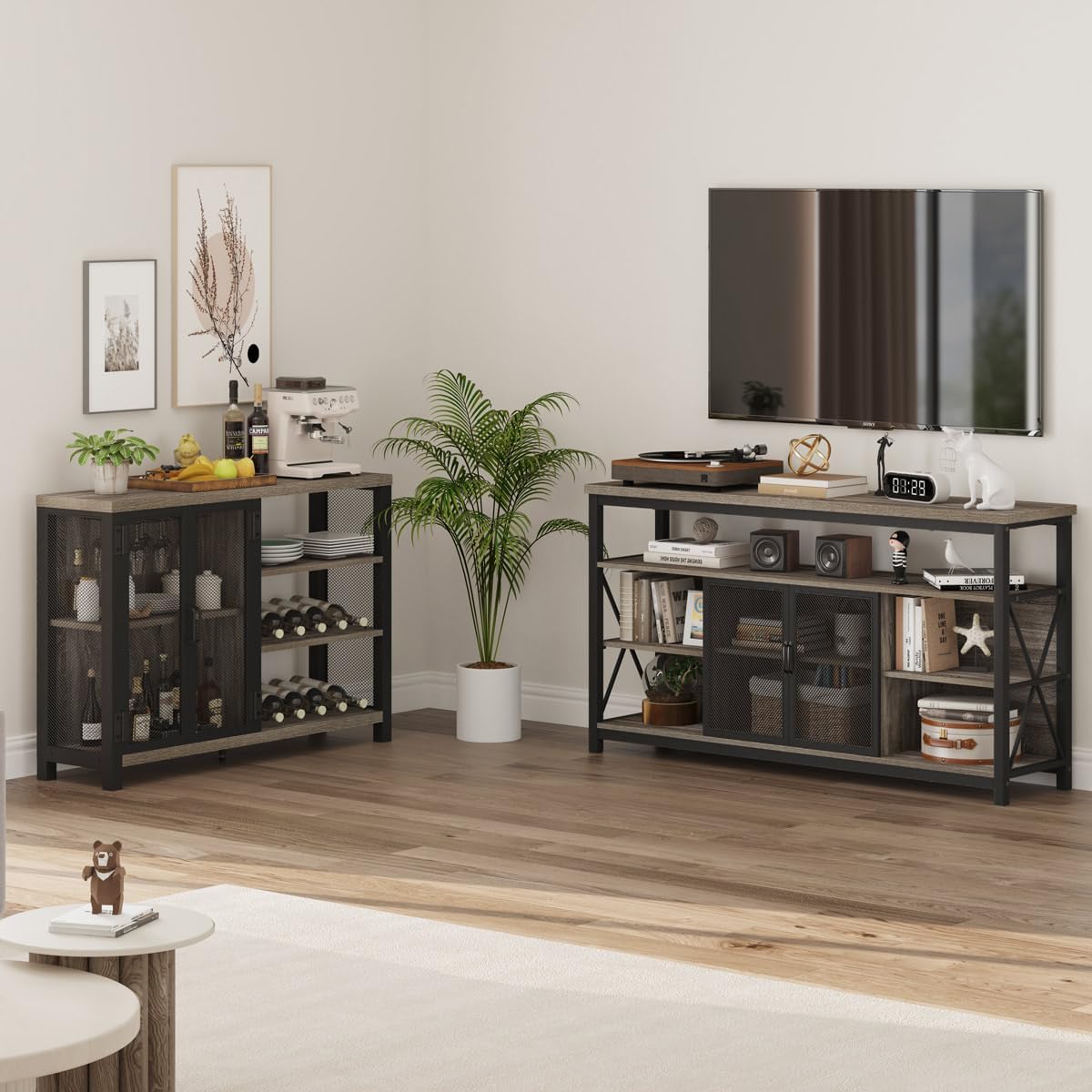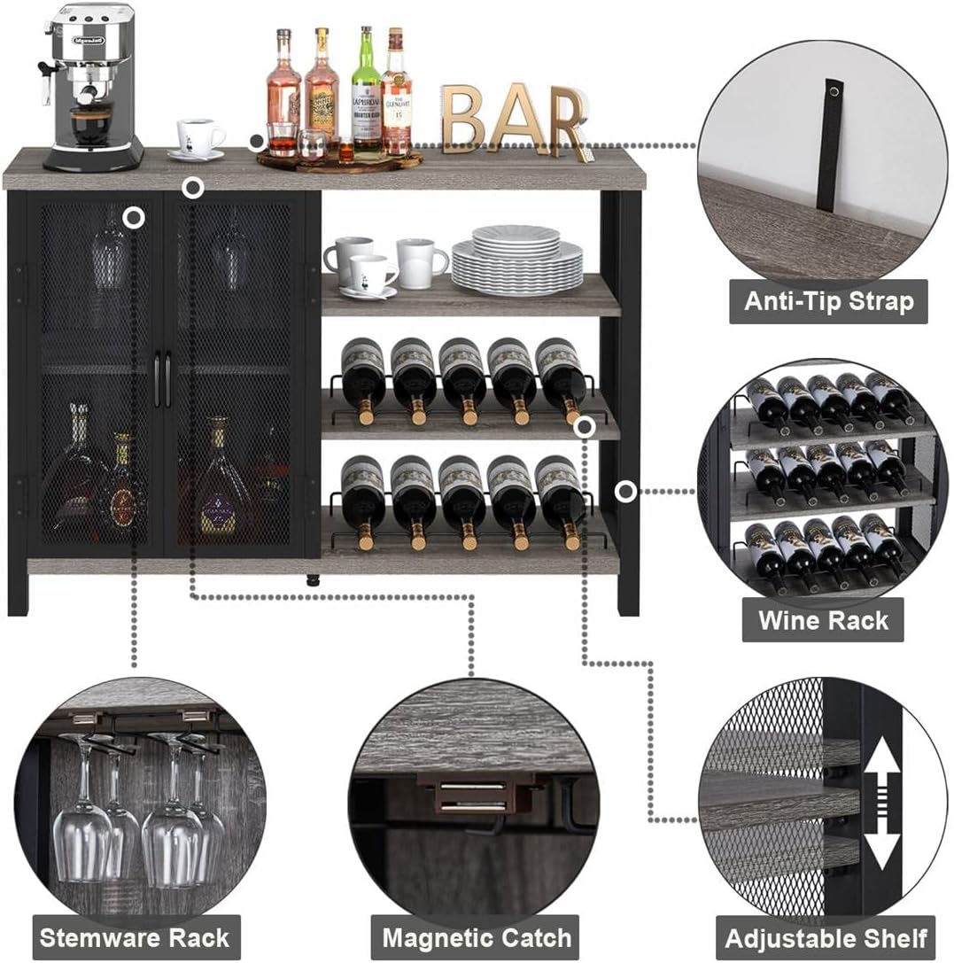 This bar cabinet is definitely its wise choice for the home. The industrial mesh frame and gray wood grain finish add a refreshing rustic appearance to this wine bar. With a spacious table, storage cabinet and adjustable shelves, this liquor cabinet is excellent for exhibiting its wine treasure, dazzling, its favorite decoration and even a microwave or coffee machine.