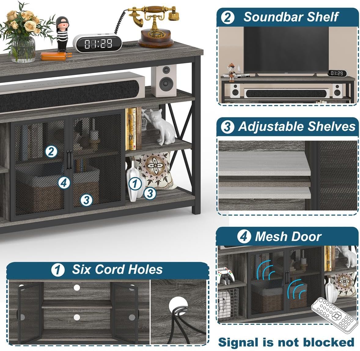 The upper part of the cabinet can handle 300 pounds, while the shelves of the medium and lower hold up to 200 pounds each. And each adjustable shelf accommodates an impressive load of 50 pounds. This TV console measures 60 “l x 15” W x 32 “H. The anti-tip device included also prevents unexpected tip.