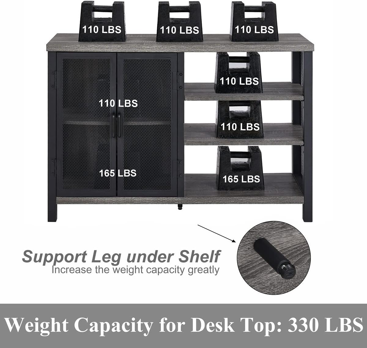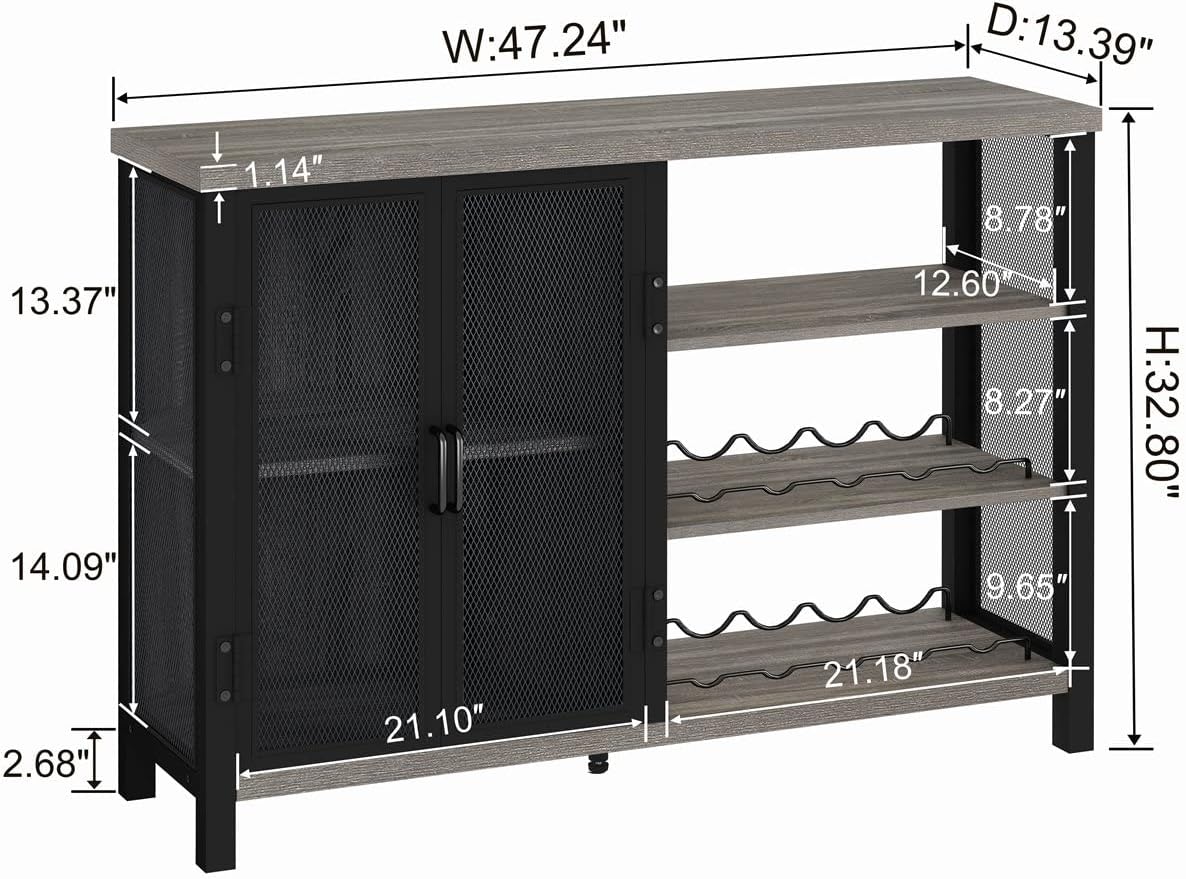 The size of the bar cabinet is 13.39 “D x 47.24” W x 32.80 “h. So that the house bar cabinet for the home is as strong as possible, we use a lower table and inferior shelf of 1.18”. The buffet table can contain up to 330 pounds, and each adjustable shelf can contain up to 110 pounds.