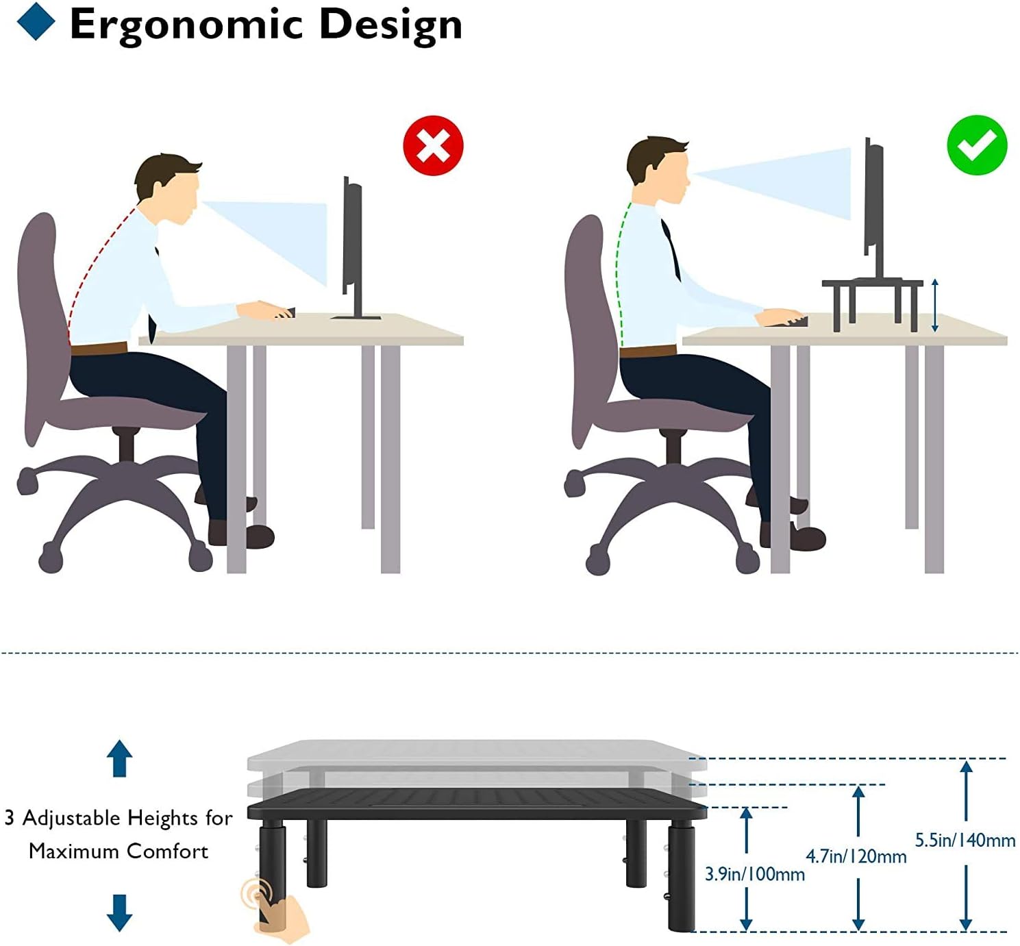 【Ergonomic and three adjustable heights】 A neck pain is a common complaint among more than 95% of computer workers, our ergonomic computer monitor support raises its screen to a viewing angle and height of adequate and comfortable eye level view to 3.9 “, 4.7” and 5.5 “with a press control of a touch, effectively improves the posture to relieve the pain of ocular The work work.