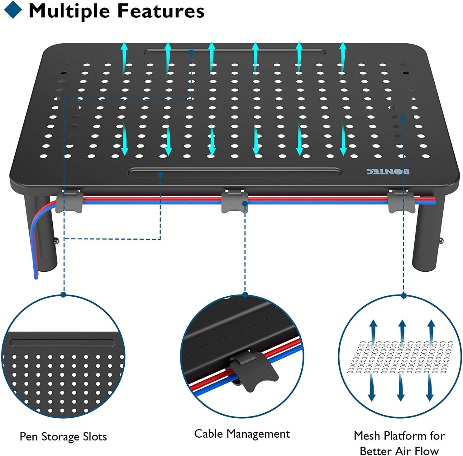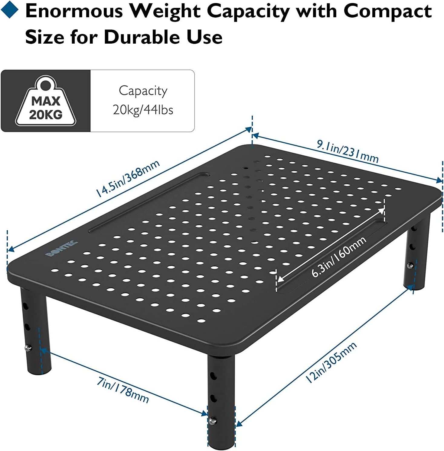 【Reduce overheating and space savings mesh platform】 The mesh platform improves air flow and heat exchange to reduce overheating devices. Its compact size of 14.5 “x9.1” With the area under this computer monitor, the desktop elevator repeats enough space for a keyboard, notebooks, telephones and more.