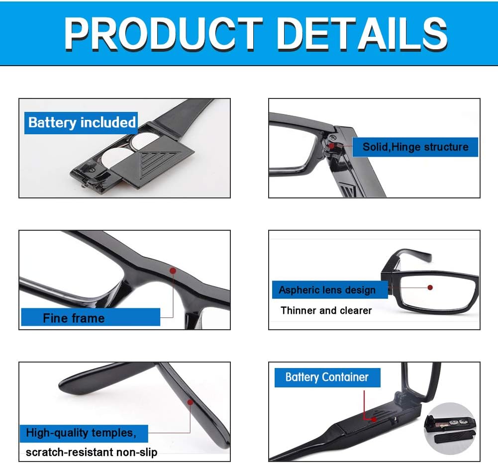 Blue light blocking lenses, aspherical lens design, thinner and clearer. Built-in ultra-bright LED lights, improve vision in the dark.