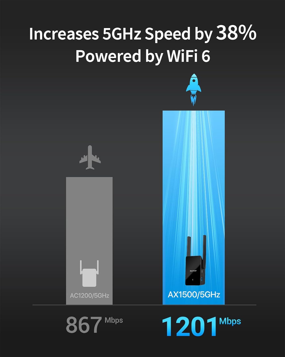 Faster 5GHz Connectivity: This WiFi bridge establishes a connection to your router at 1201Mbps on the 5GHz band, a 38% performance increase over other AC1200 adapters. Upgrade your wired device with the speeds and reliability of WiFi 6