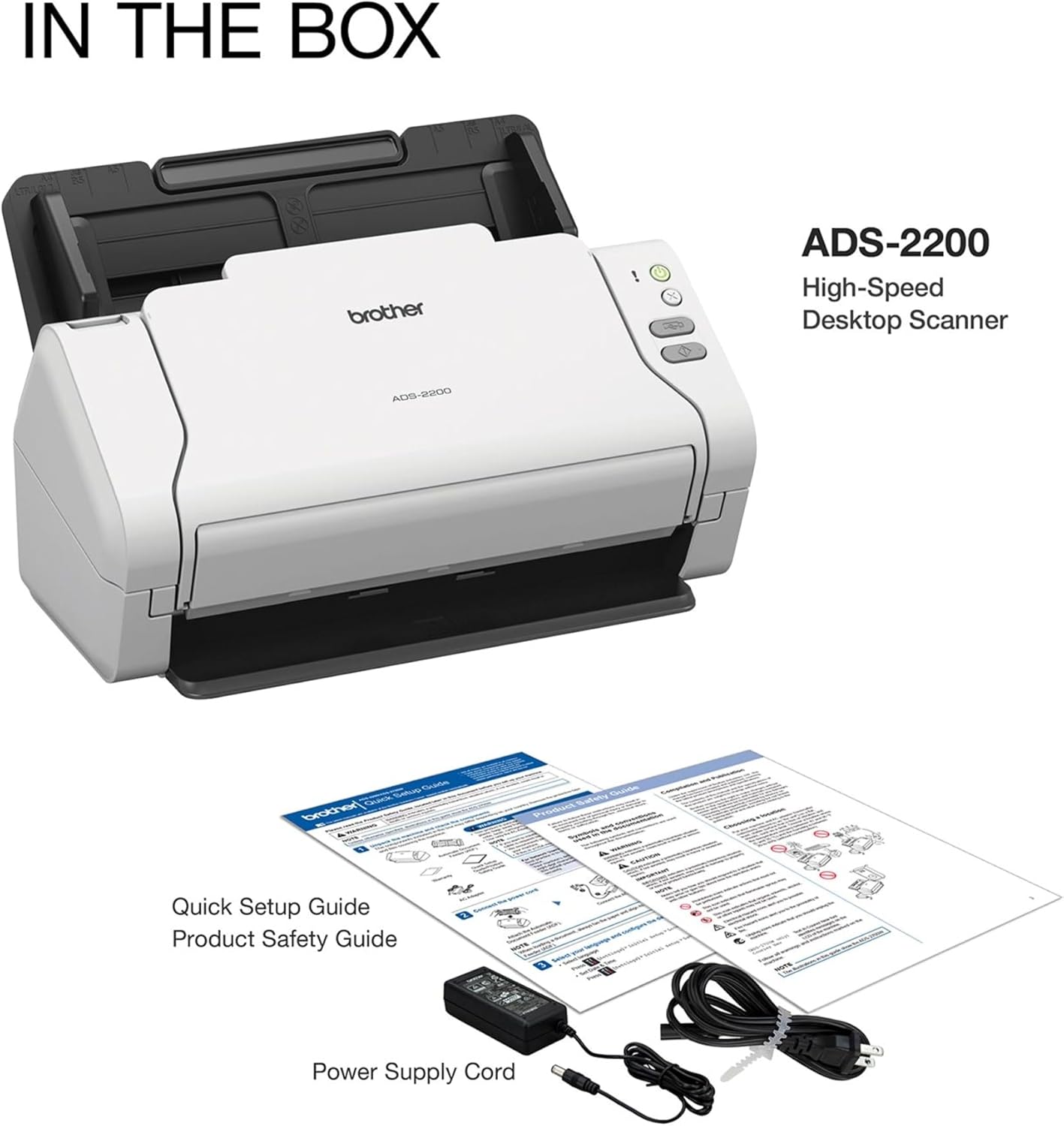 The Brother ADS-2200 is a high-speed, duplex color desktop scanner perfect for small businesses or home offices – fast, reliable and affordable. Designed to scan single or double-sided documents with a capacity of up to 50 sheets thanks to the built-in automatic document feeder with additional continuous page scanning, the Brother ADS-2200 can scan to multiple destinations and offers multiple connectivity options. This desktop scanner is designed to save space, yet can handle multiple media types and paper sizes including legal and long paper, business and plastic ID cards, receipts and photos. The ADS-2200 was designed to be easy to use. A great example of this is the simple and intuitive user interface that offers customizable one-button scanning. Automatic document size detection makes it easy to scan documents of different sizes. The ADS-2200 also offers the ability to scan and retrieve files without installing any special software on the connected PC because it is recognized as a mass storage device when used with a USB flash memory drive(2), with minimal configuration required on the host device. The ADS-2200 is compatible with Windows, Mac and Linux environments along with TWAIN, WIA for PC, ICA for Mac and SANE(3) drivers, providing the flexibility you need to support your business processes and systems. The ADS-2200 also includes multiple image optimization features, including background removal, multi-feed detection and blank page removal. A bundled software package also includes a business card management and desktop document storage program. Users can also scan and send to email, file, image, printer or OCR and to mobile devices(4). (1) Color and black and white scan speed, LTR at 300 dpi. See manufacturer's website for details. (2) USB flash memory drive sold separately. (3) ISIS driver is not available for Windows XP. SANE driver is available for download from Brother Solutions Center. Please visit the manufacturer's website. (4) Requires connection to a wireless network. Please check the manufacturer's website for more details, availability and mobile device support.