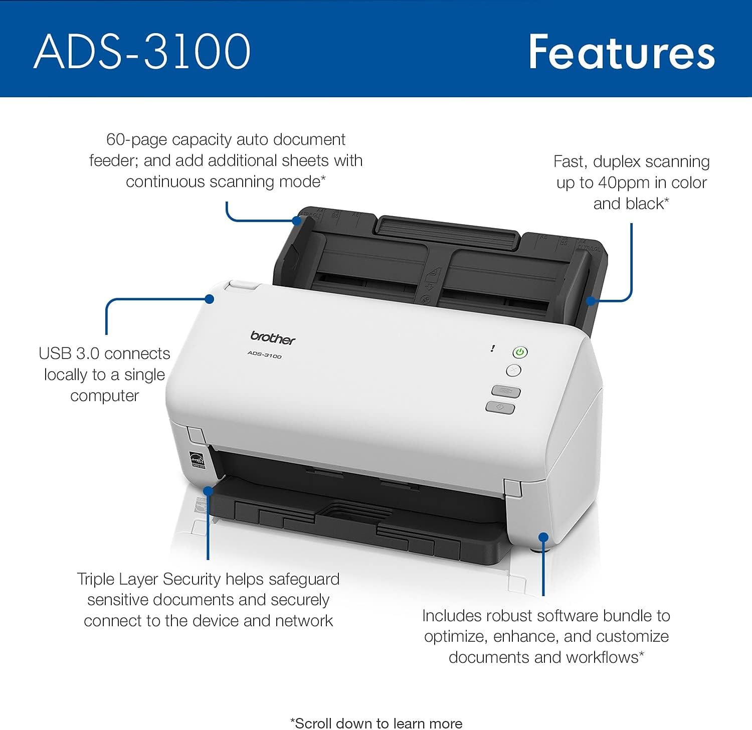 Brother ADS-3100 High Speed Desktop Scanner | Compact with S…