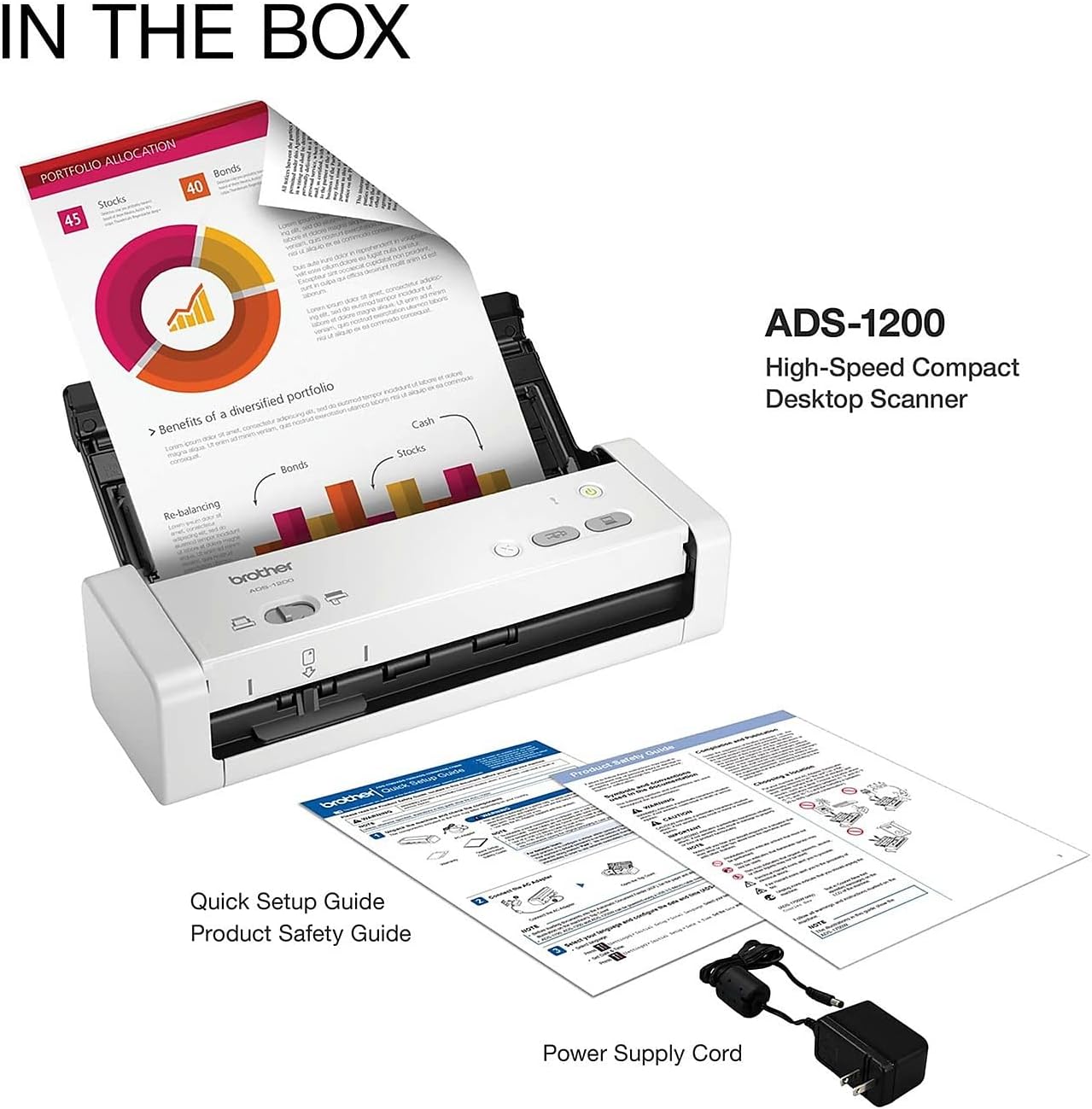 The Brother ADS-1200 Compact Desktop Scanner is ideal for small or home office professionals thanks to its compact design and simple workflow applications. The ADS-1200 offers color, duplex and single-pass scanning speeds of up to 25 ppm1, a 20-page capacity automatic document feeder for scanning documents, receipts, photos and more, plus a dedicated card slot for scanning plastic cards. Power the ADS-1200 via a USB 3.0 connection to your laptop or PC6 to make it highly portable. Mass storage device recognition allows you to scan and recover files without installing special software on the connected PC. Scan to multiple destinations, including File2, OCR2, email, and USB flash drive3. The ADS-1200 is compatible with Windows, Mac and Linux and supports TWAIN, WIA, ICA and SANE4 drivers. The scanner software package provides OCR and document management software for easy document storage and retrieval5. Image optimization allows you to improve scans for optimal images. Includes a one-year limited warranty.Disclaimers:1. Scan speed in color and monochrome, LTR at 300 dpi.2. When connected to a PC with applicable software.3. USB flash drive sold separately.4. Drivers and included software are available by download from the manufacturer's website. Requires Internet connection. See the User Guide for more information.5. Features dependent on downloaded driver and software. Document management programs included that are downloaded separately from the manufacturer's website. Requires Internet connection. See the User Guide for more information.6. Requires USB 3.0 compatible PC and cable.