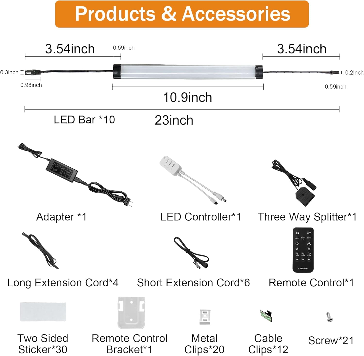 Adapter*1, LED controller*1, three -way divisor*1, long extension*4, short extension cable*6, LED bar*10, two -sided sticker*30, screw*21, remote control*1, remote controller support*1, metal clips*20, cable clips*12