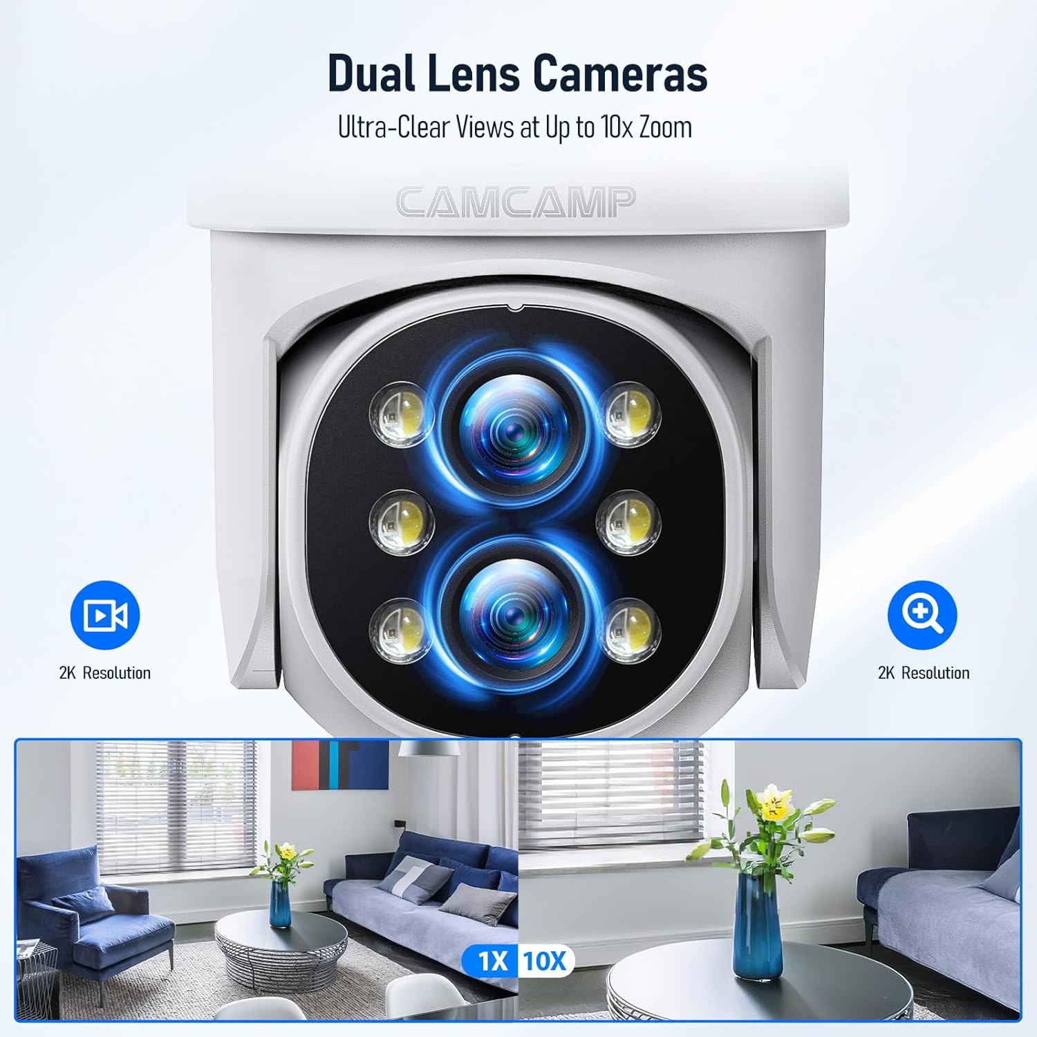 👍【Dual Lens, 10x Hybrid Zoom】The wide-angle and telephoto lenses of the outdoor camera give you a wide overview and a clear close-up at the same time. You will see more detailed content in the camera image, and small objects will appear larger and clearer in your field of view.