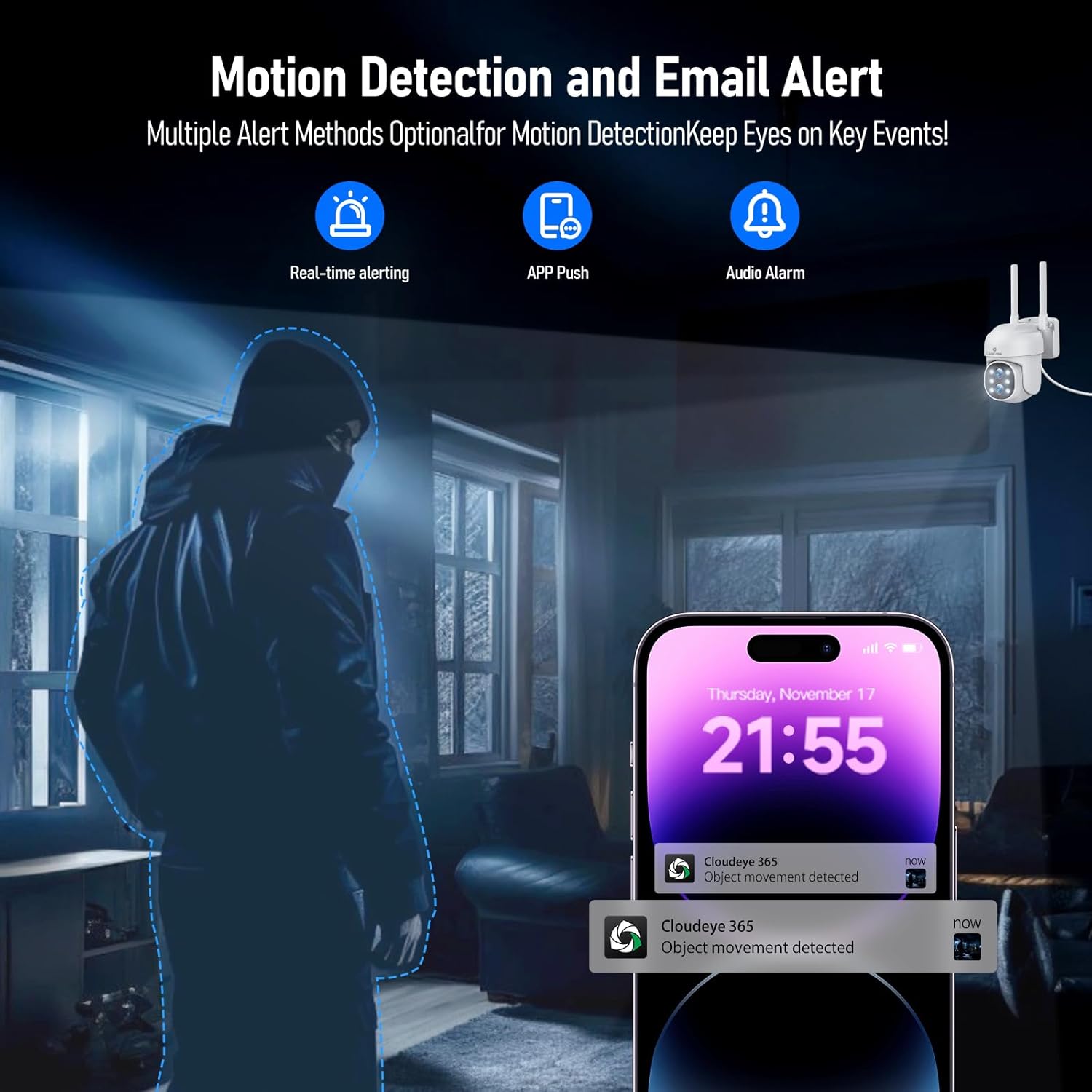 💪【Automatic Motion Tracking & Instant Alerts】Our outdoor camera system enjoys peace of mind with intelligent motion detection. Receive real-time alerts on your mobile phone and react immediately with sound and light alarm systems. Siren and bright light provide double security.
