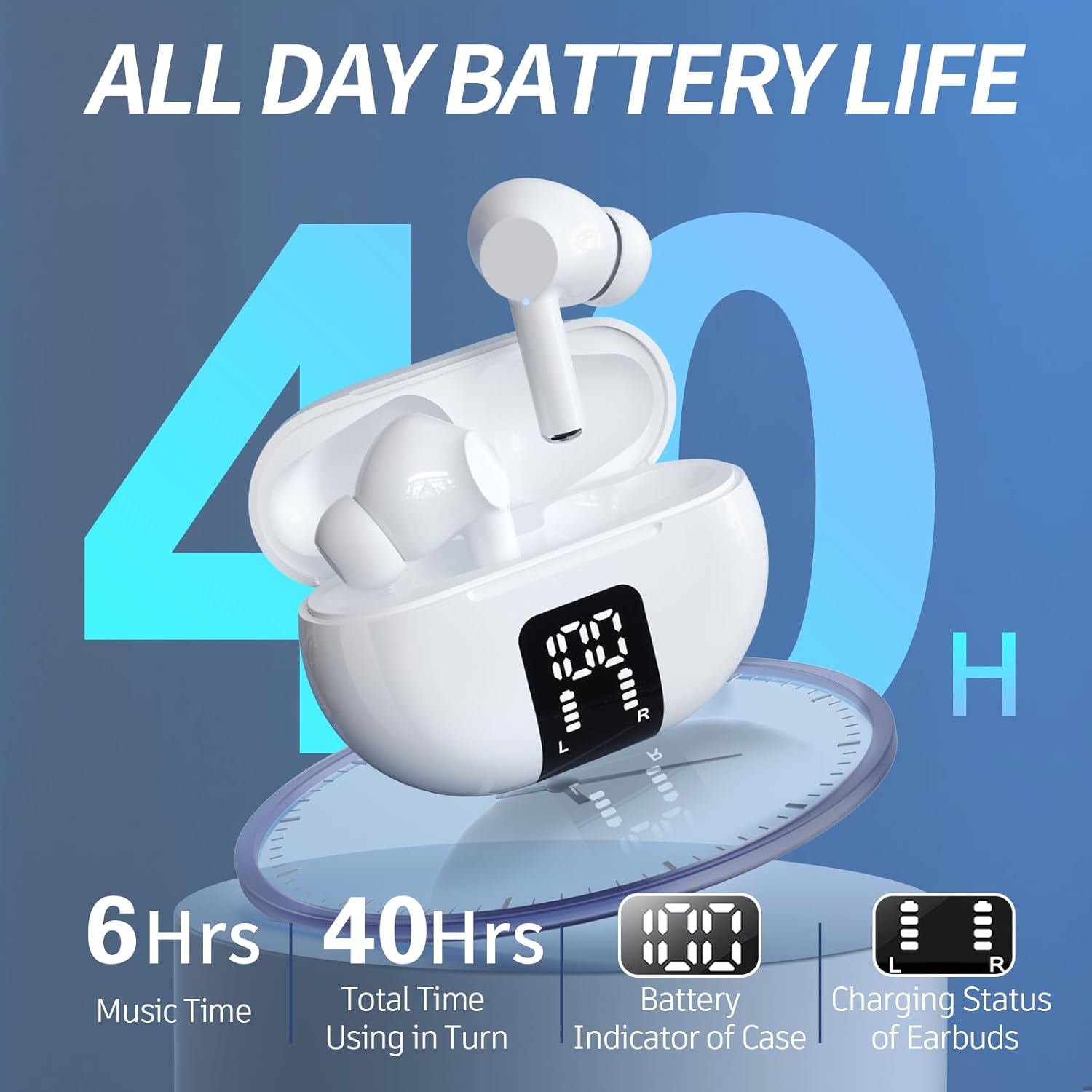 Ready for anything: The earbuds can last for 6 hours on a single charge. With the accompanying charging case, you can enjoy a total playtime of up to 40 hours before needing to recharge. Whether you’re on a long trip or simply don’t have time to charge them, our earbuds have your back. They feature an LED display that shows the status of each individual earbud and the exact charge left in the case. Say goodbye to guessing games and always stay prepared with our intuitive LED charging display.