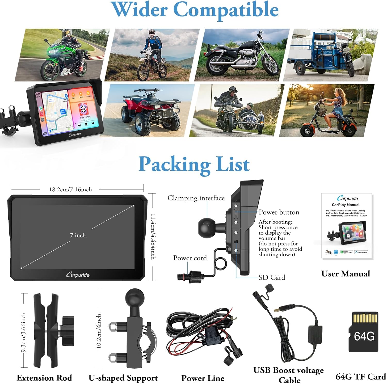 7 “IPS HD Touch Screen: The motorcycle carplay screen is equipped with a 7 -inch high -definition IPS touch screen with a resolution of 1024*600, which makes the visual effect more intuitive and the touch responding. Vibrant 65K color 65K and up to 1000 nit peak shine 64K TF.