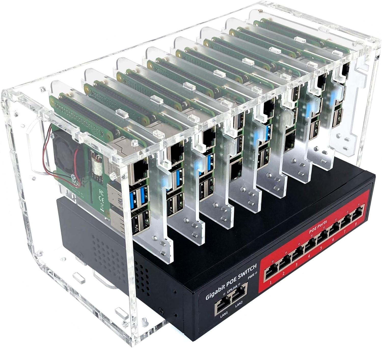 8 port POE switches will be adjusted with a cantilever, as seen in this image. Cloudlet case fans (included) will be adjusted to internal or external mounts. Keep in mind that the fans are fed by GPIO, if Poe Hat is installed, the Gpio pins will be covered by Poe Hat.