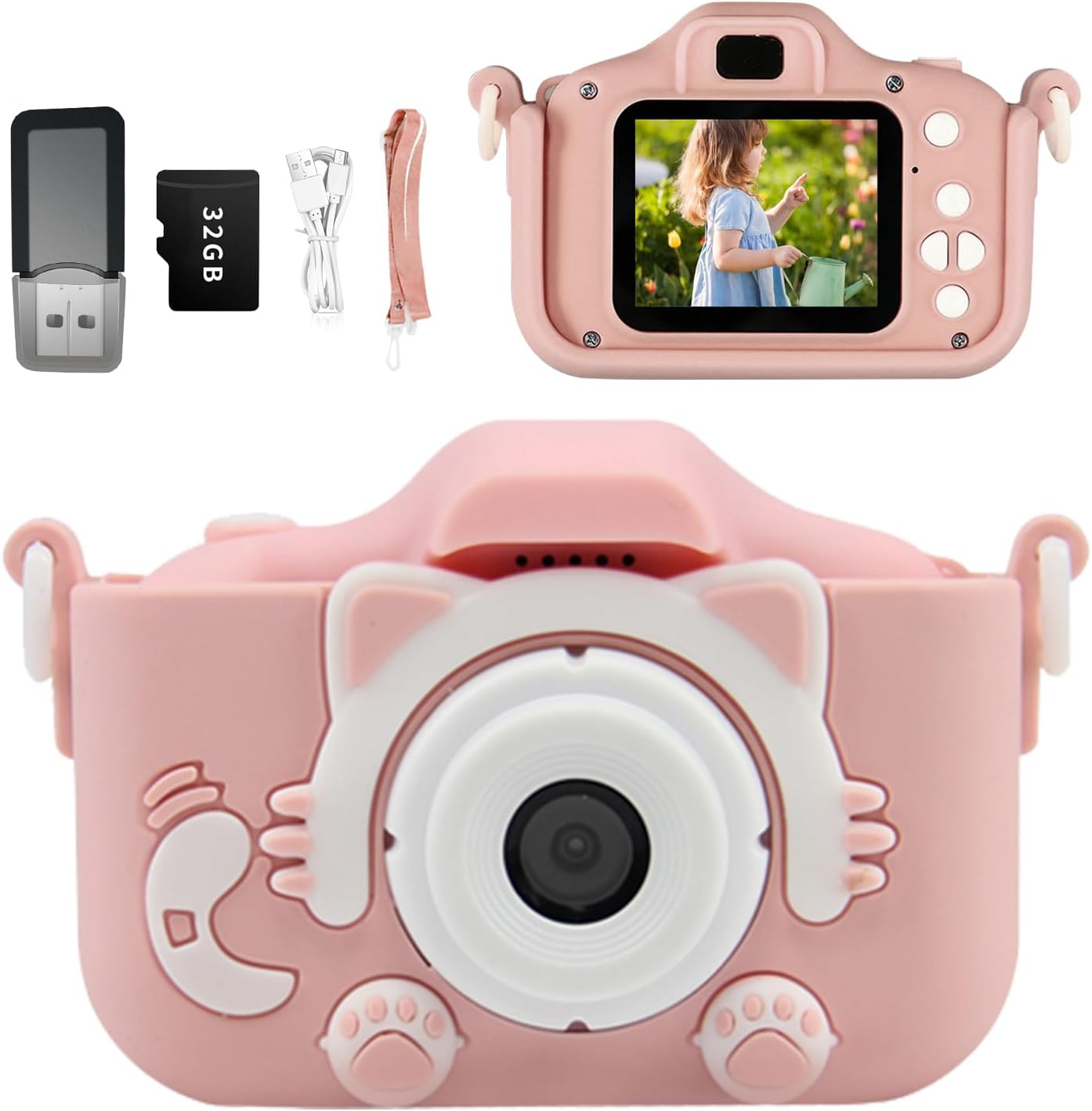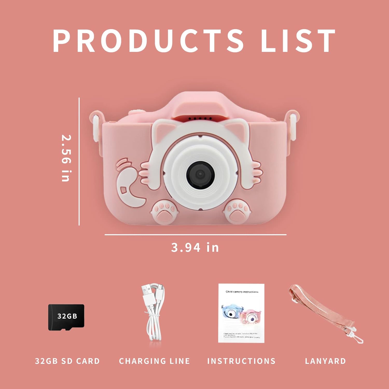 1*Kids Camera, 1*USB Charging Cable, 1*32GB SD Card, 1*Card Reader, 1*Lanyard, 1*User Manual.