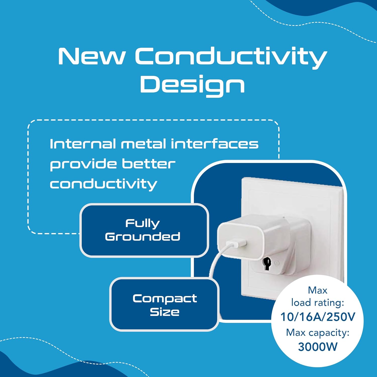New conductivity design: internal metal interfaces provide better conductivity. Maximum capacity of up to 2500 watts (maximum of 250 volts, 10 a)