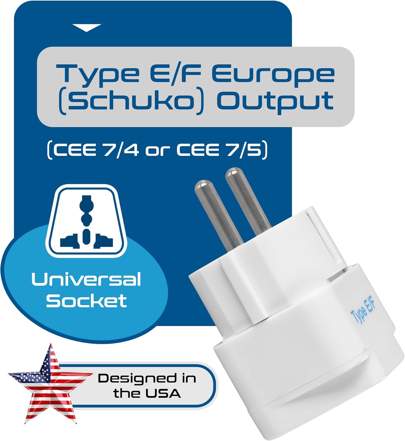 Compact heavy duty – E/F plug adapter of 3 -pointed earth type – compatible in most European countries, such as