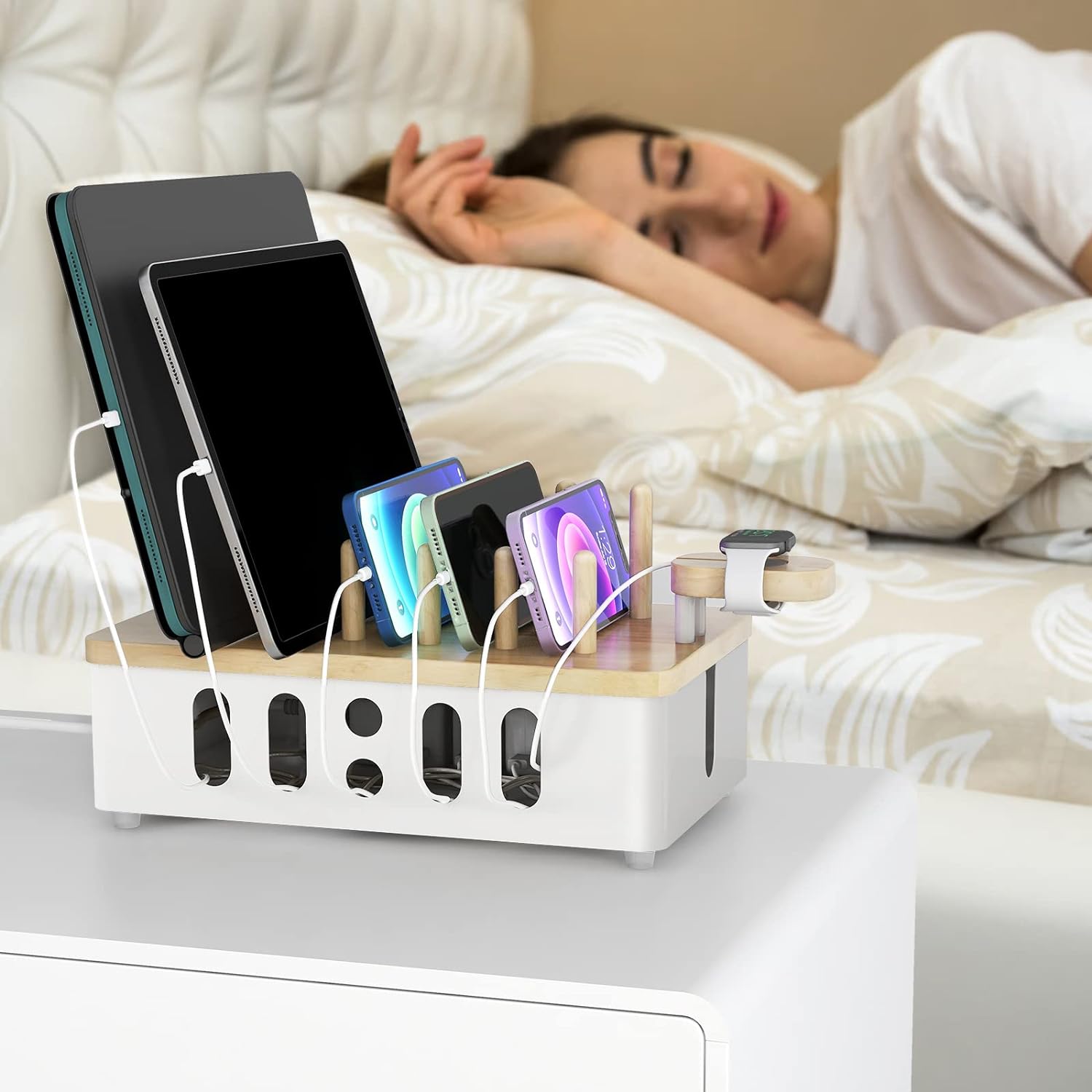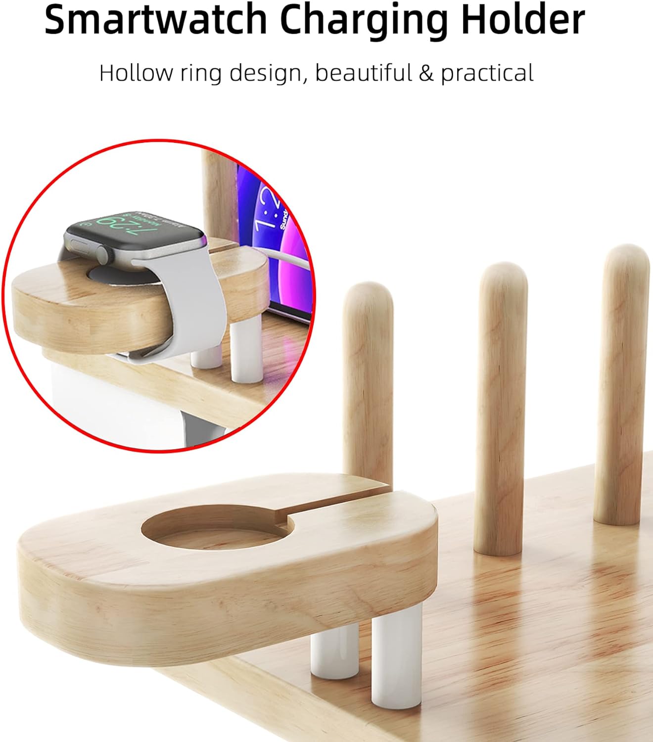 ✔【New Upgraded Integrated Design】 — Stylish and simple charging station, multi-device organizer integrated design, it is strong enough to use, not easy to break and has good carrying capacity. Holds up to five smartphones or tablets, with a hollow ring design smart watch charging stand.