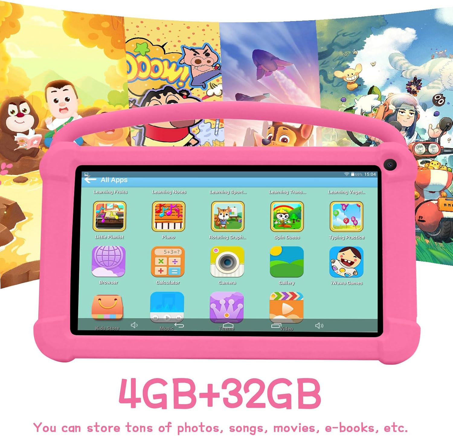 【Eye protection screen】 7 -inch tablet for children with Quality HD Visualization screen 1024×600. The clear and brilliant screen provides an exceptional visual experience when children read and watch the videos. Automatic brightness adjustment can better protect your eyes, reduce eye fatigue.