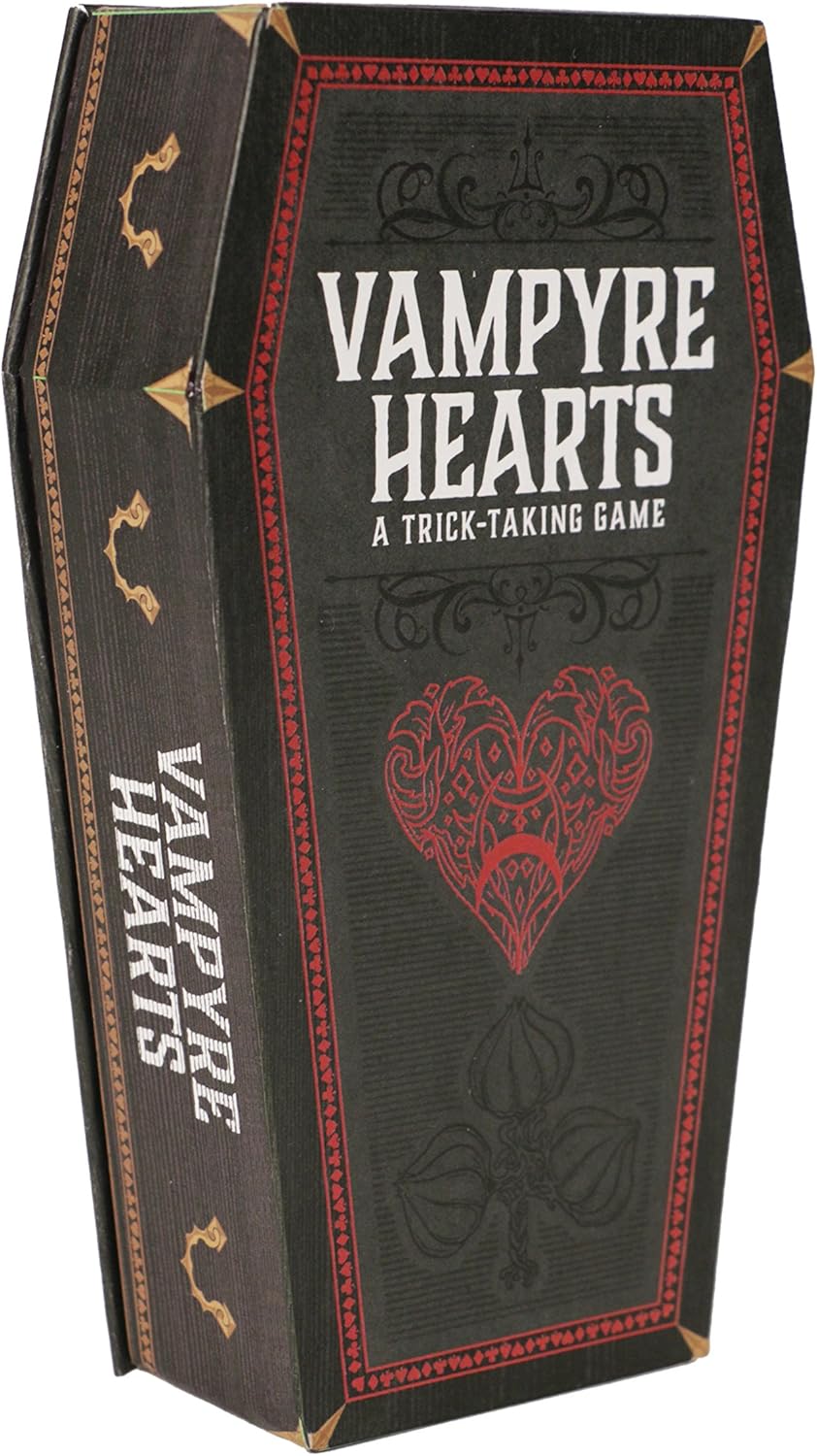 Up the ante on the classic game of Hearts with a chilling take on the trick-taking card game! With the Vampire Queen hiding among your companions, her thirst for Hearts may send everyone to an early grave. Can you defeat her before time runs out? Presented in a beautiful coffin-shaped box, this set includes a deck of unique illustrated cards and rules for the standard game of Hearts, as well as expanded rules and a token for a vampire variant that adds hidden roles and ulterior motives to the fast-paced classic. Get ready for an exciting, bloodthirsty night of gaming for new and experienced players alike!