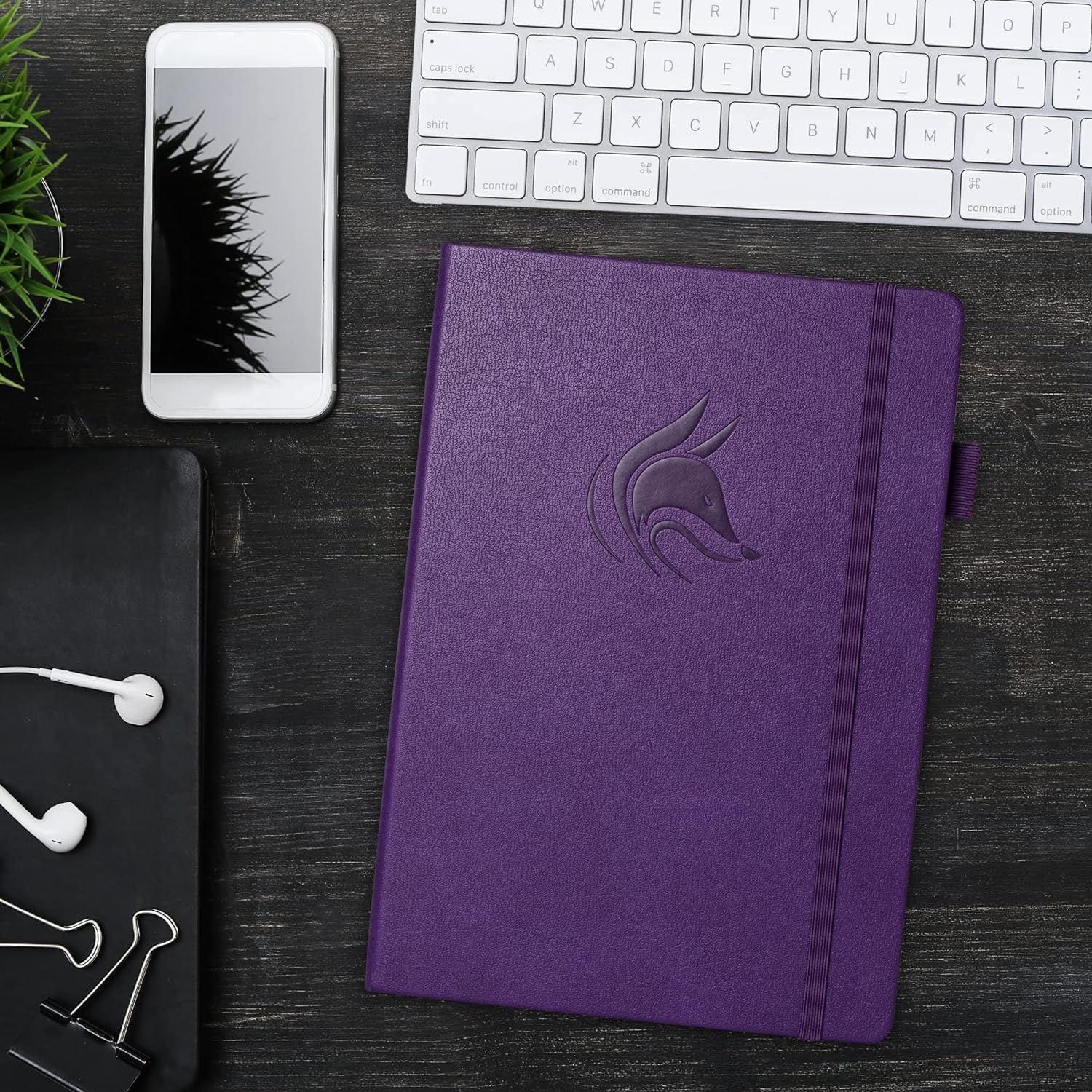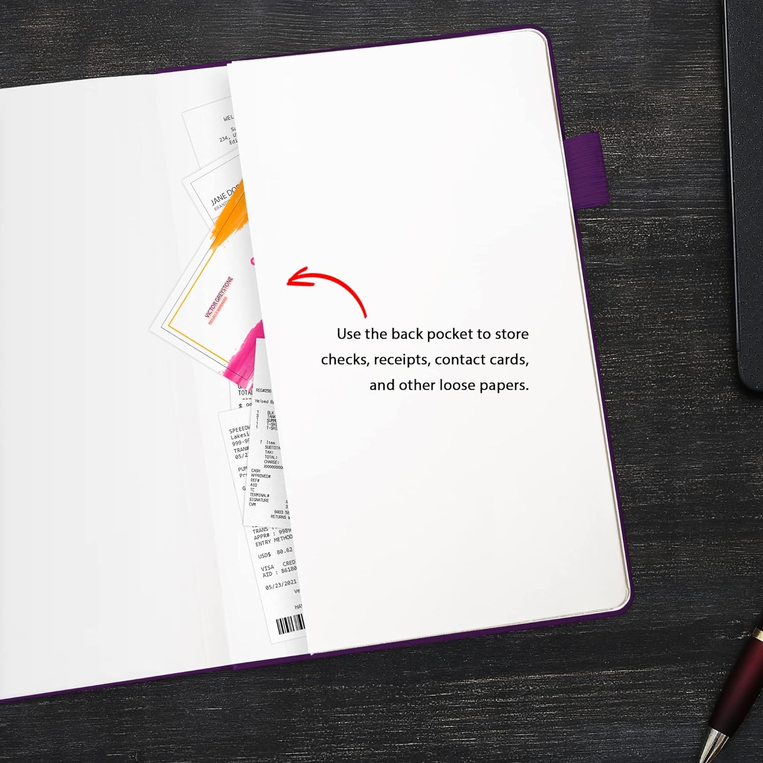 Vegan leather hardcover Thick 120gsm paper Pen loop Elastic closure Ribbon bookmark Interior pocket for loose notes and receipts