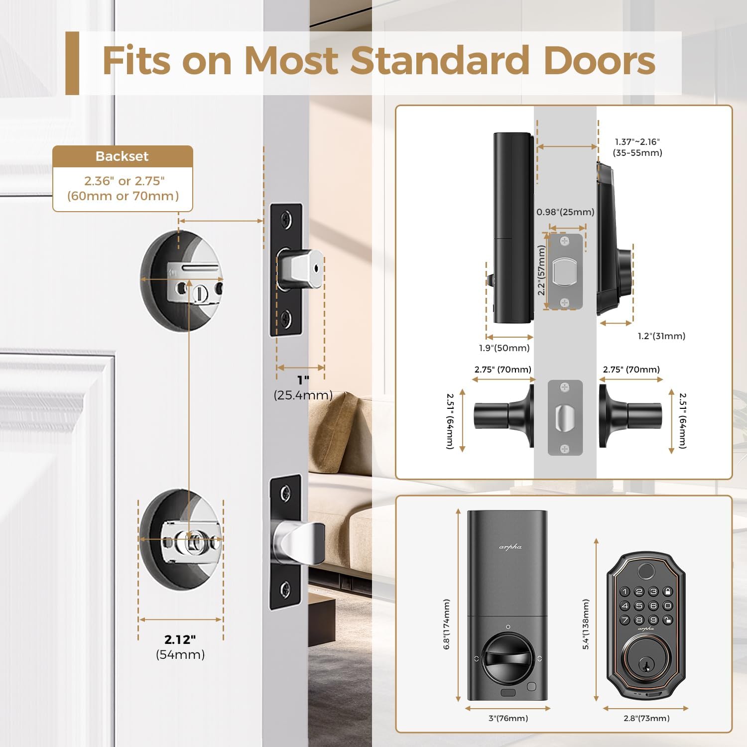 Easy installation: keyless door locks could replace the basic doors locks. During the installation, our lock will not cause any damage to the door panel. Lock Smart Door Tae just a few minutes to finish the installation. ARPHA D280W could adjust the thicknesses of the door of 1-3/8 “to 2-1/8” (35 mm-55 mm) with cams 2-3/8 “(60 mm) and 2-1/8” (70 mm).
