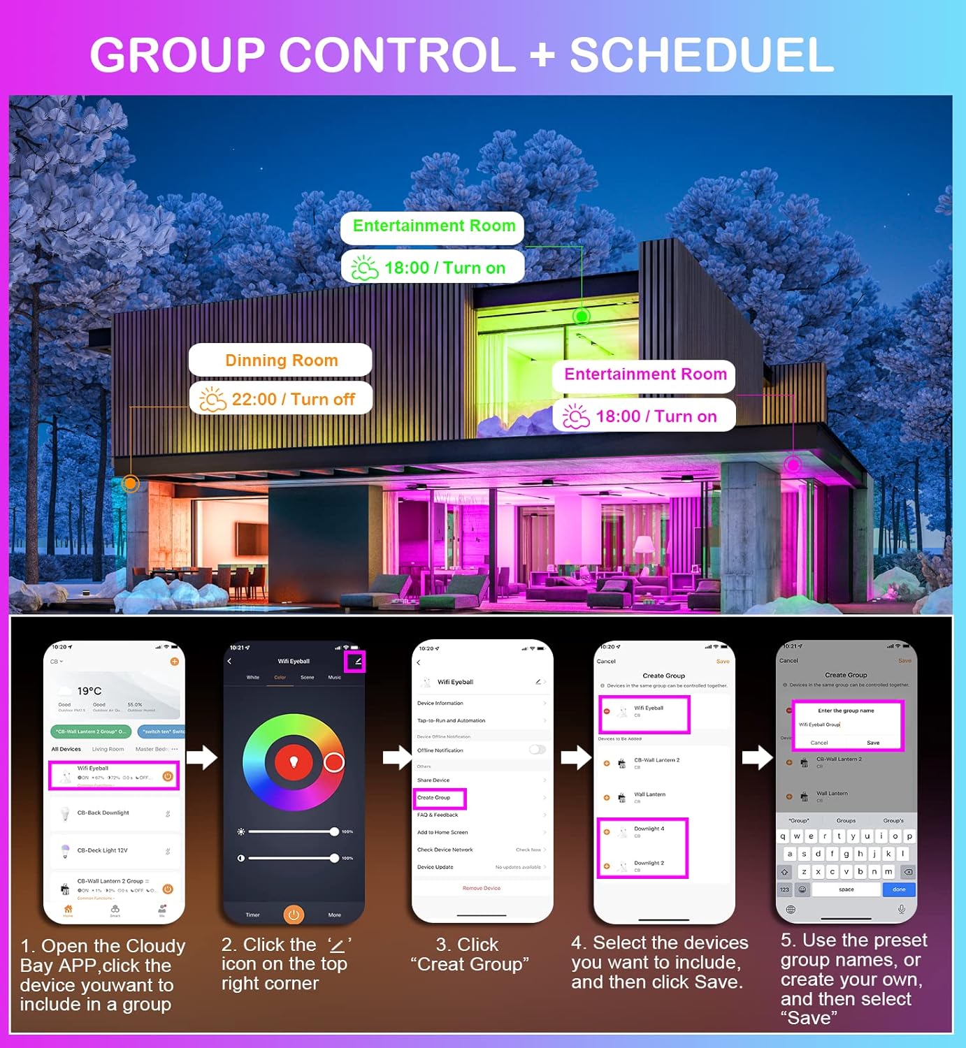 【App Control】Download CloudyBay APP on App Store, quickly enjoy smart life with APP control: precisely set the lights from 2700K to 6500K, and over 16 million colors, etc.