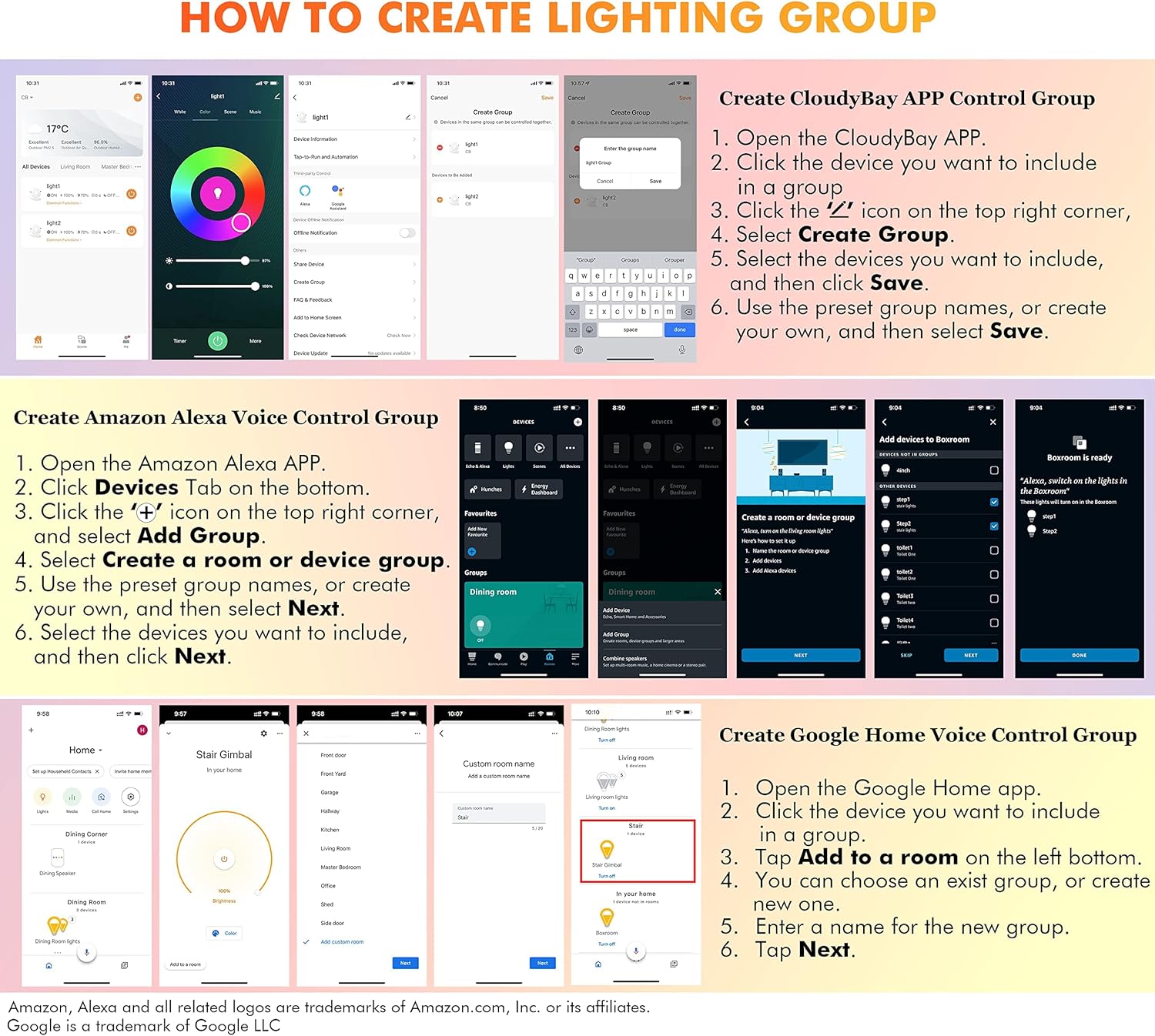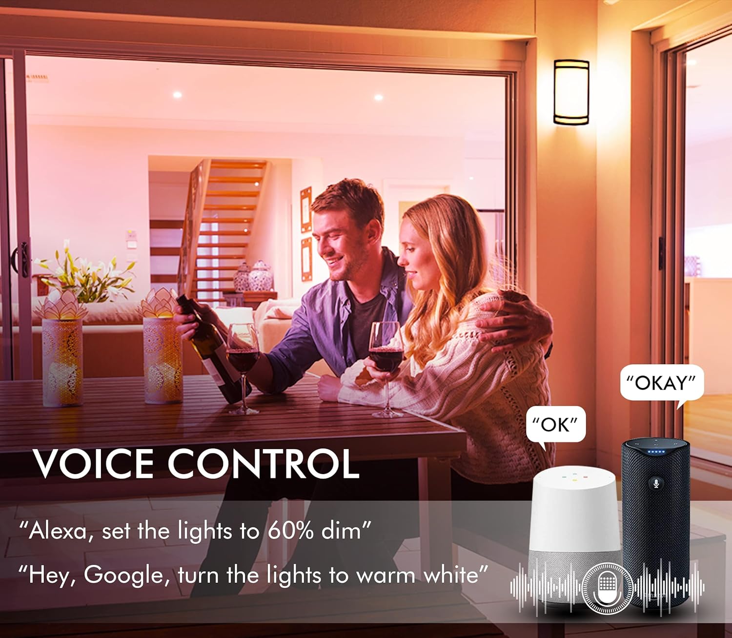 Voice Control: Compatible with Alexa and Hey, Google. Use simple conversations to control the lights and free your hands like “Alexa, turn the light to daylight”. The reply is “OK” and then change the lighting.