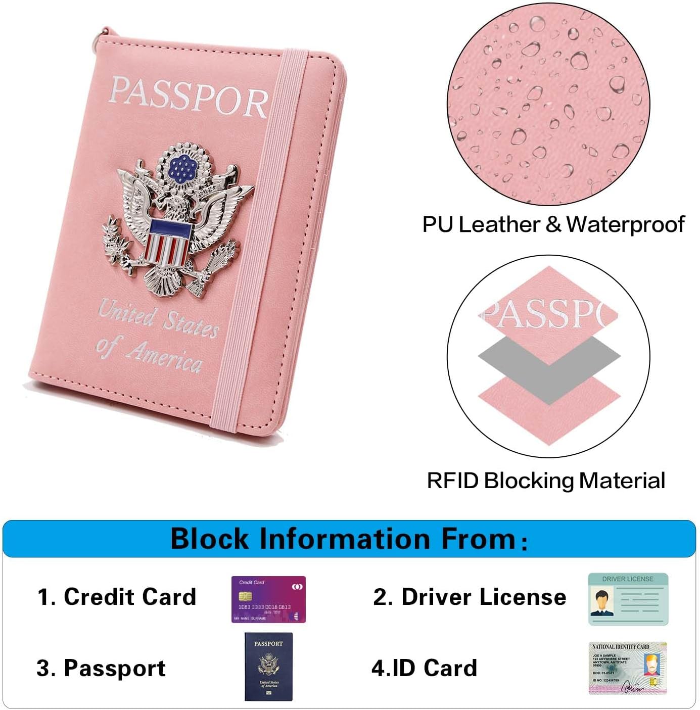 SECURITY PROTECTION: RFID blocking protection material inside. Our passport case has a material specifically designed to block 13.56 MHz or higher RFID signals and protect our important private information stored on your passport and credit cards from unauthorized scanning. To ensure the safety of your personal information. Also, the elastic strap is very important to keep everything safe. The passport cover has 3 card pockets, 1 transparent window, 1 airline ticket slot, 1 passport slot.