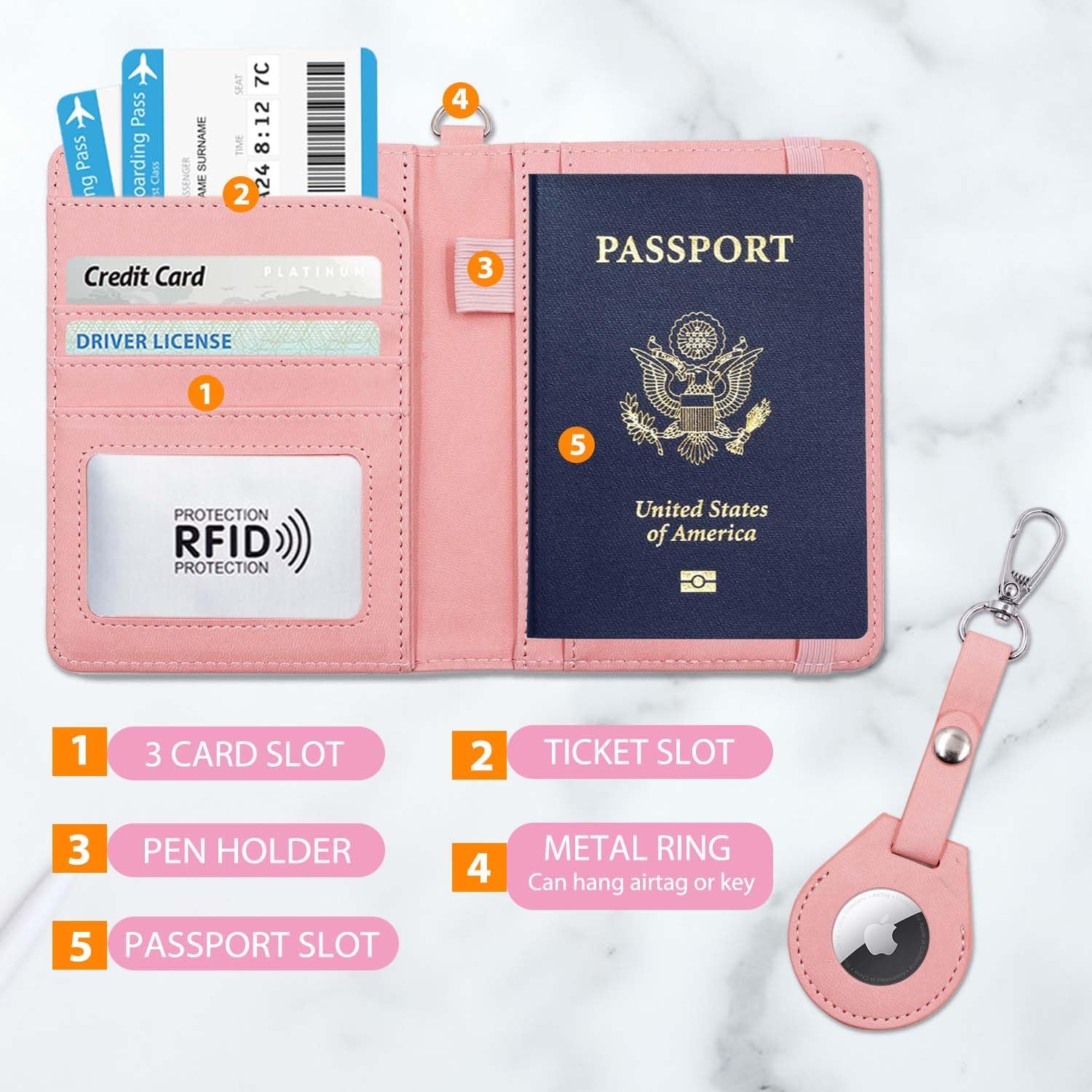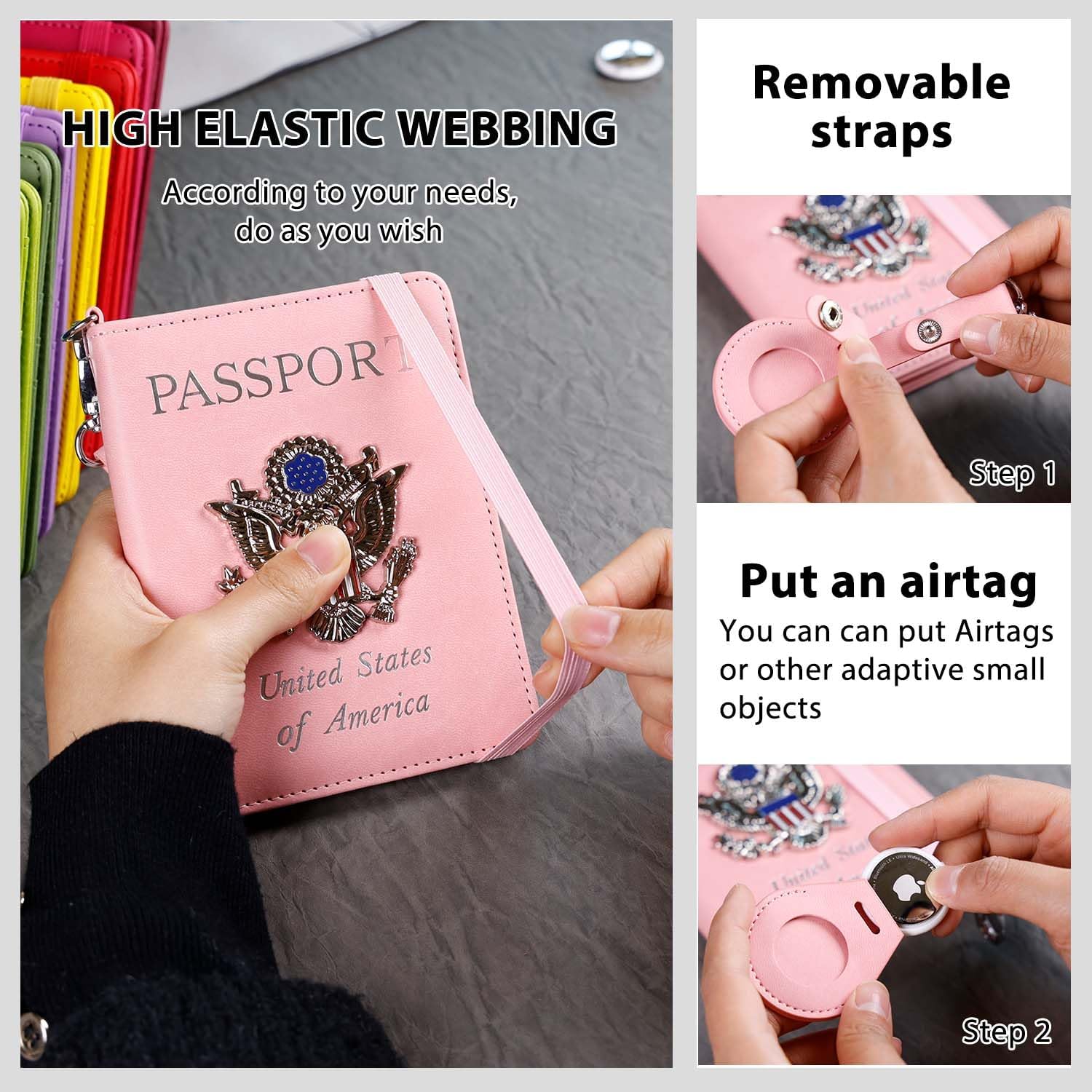 MULTIFUNCTION: The Airtag Passport Holder Cover Wallet Case is a travel essential that combines functionality, security and style. Comes with an elastic strap that can secure the items inside and can hold passport, credit cards, money, SIM cards, air. tickets, boarding passes and more, the passport cover won't open in your bag. The pen slot is convenient for you to fill out customs forms frequently when traveling internationally.