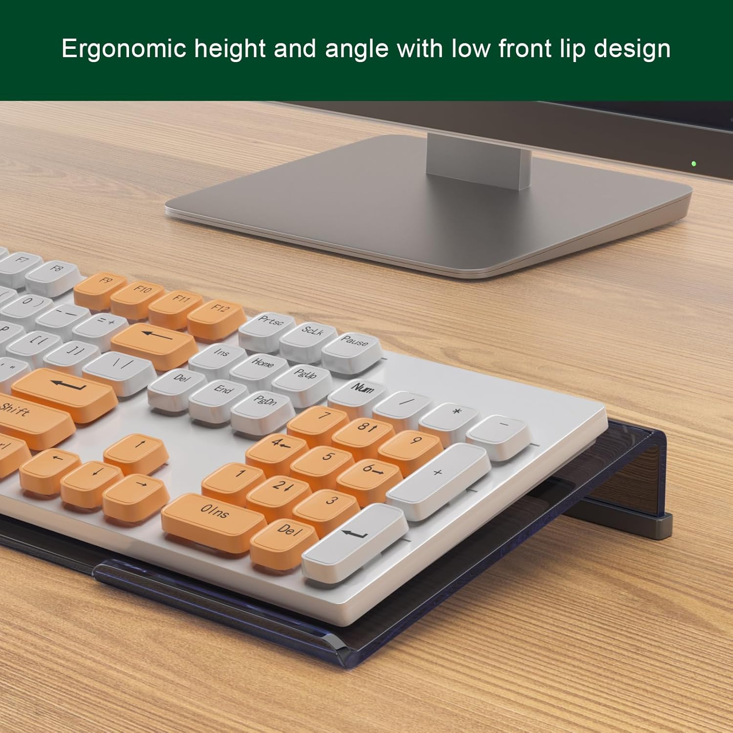 Ergonomic Design: keyboard stand for desktop is made for more comfortable typing, the inclination of the keyboard tray is appropriate, not too high, not too flat either, places the keyboard at just the right angle and greatly improves your ergonomic home office setup. The acrylic design keyboard riser provides comfortable support, reduced strain and fatigue on your neck and wrists, for anyone spending long hours typing away at a desk, the keyboard lift is a game changer for work comfort.