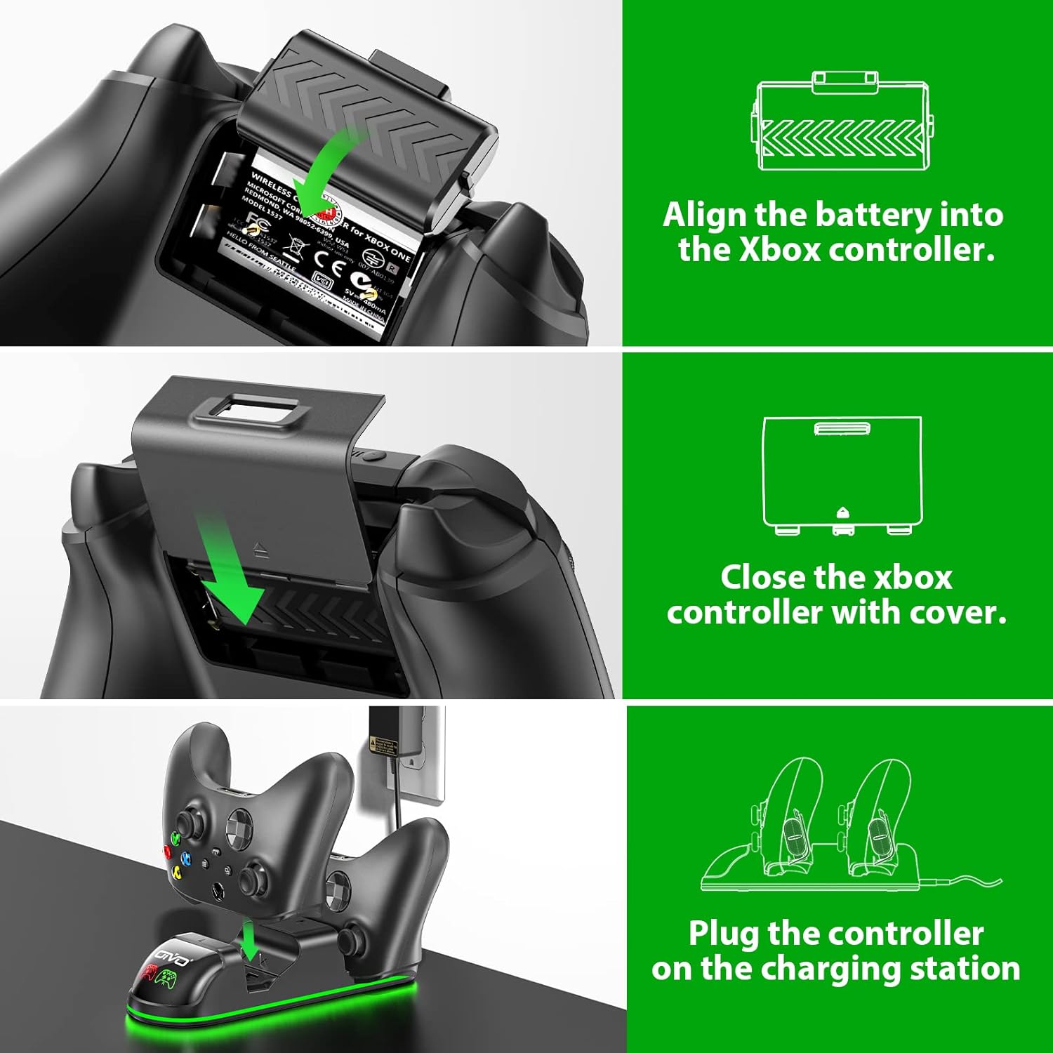 : Smart Charging & LED Indicators: This Xbox controller charging station with rechargeable battery packs for Xbox is designed with smart charging board that gives the charging dock over-heat and short-circuit protection. The rechargeable battery charger for Xbox controller will automatically stop charging when the batteries are fully charged, Xbox 1 remote charging station with 2 LED charging indicators show the charging status: red light indicates charging, green light indicates fully charged/standby.
