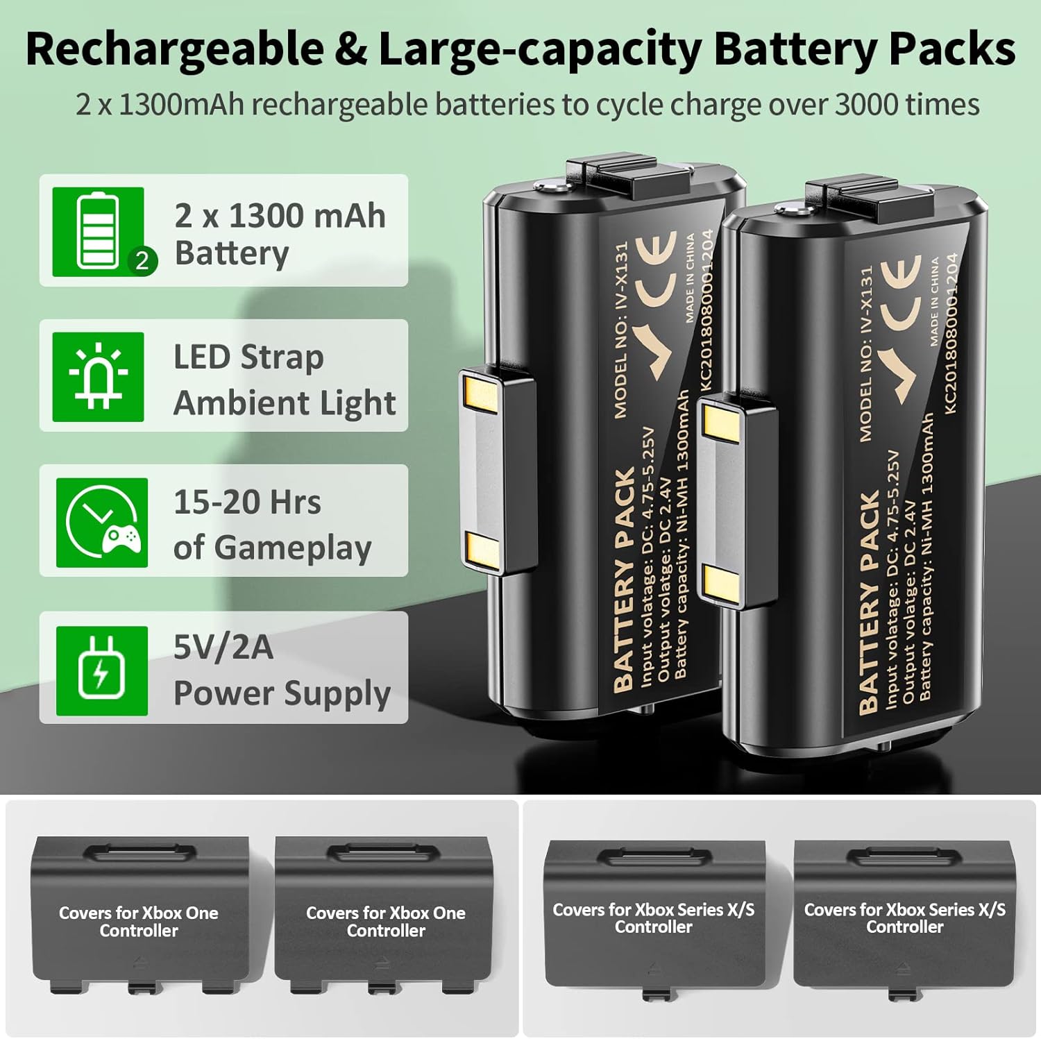 3000+ Times Rechargeable Battery Recycling – Xbox Series X controller charging station with 2 Xbox rechargeable battery packs. Our eco-friendly 4800mWh rechargeable batteries for Xbox One can be recharged over 3000 times, so you can always be ready for your game. Say goodbye to AA batteries to save money and time!