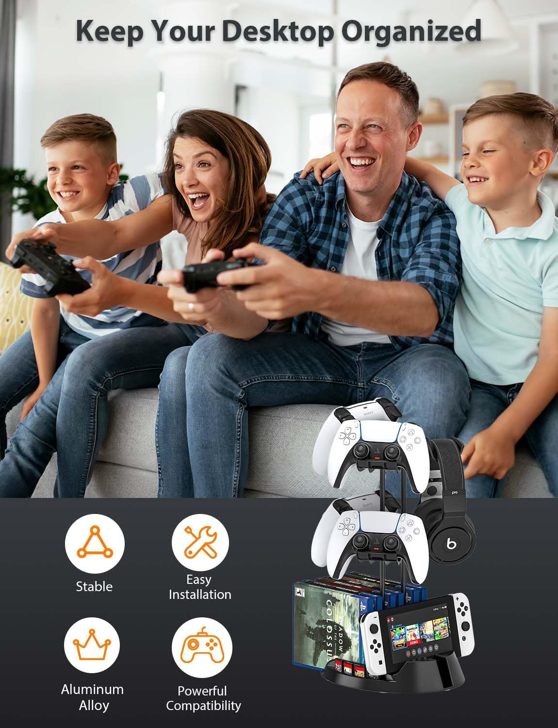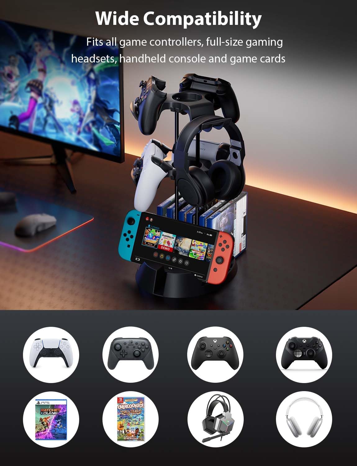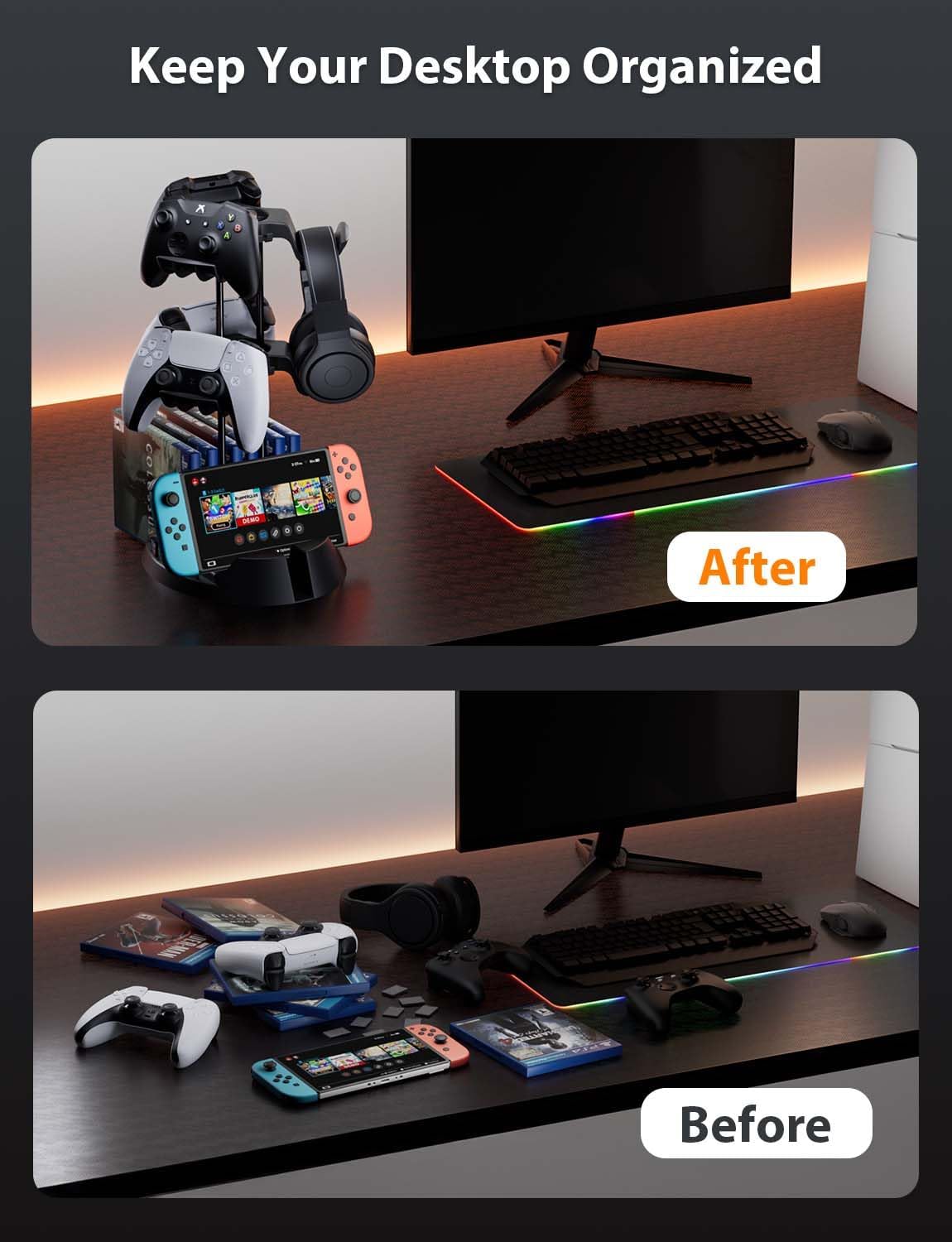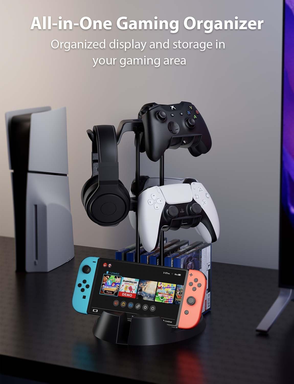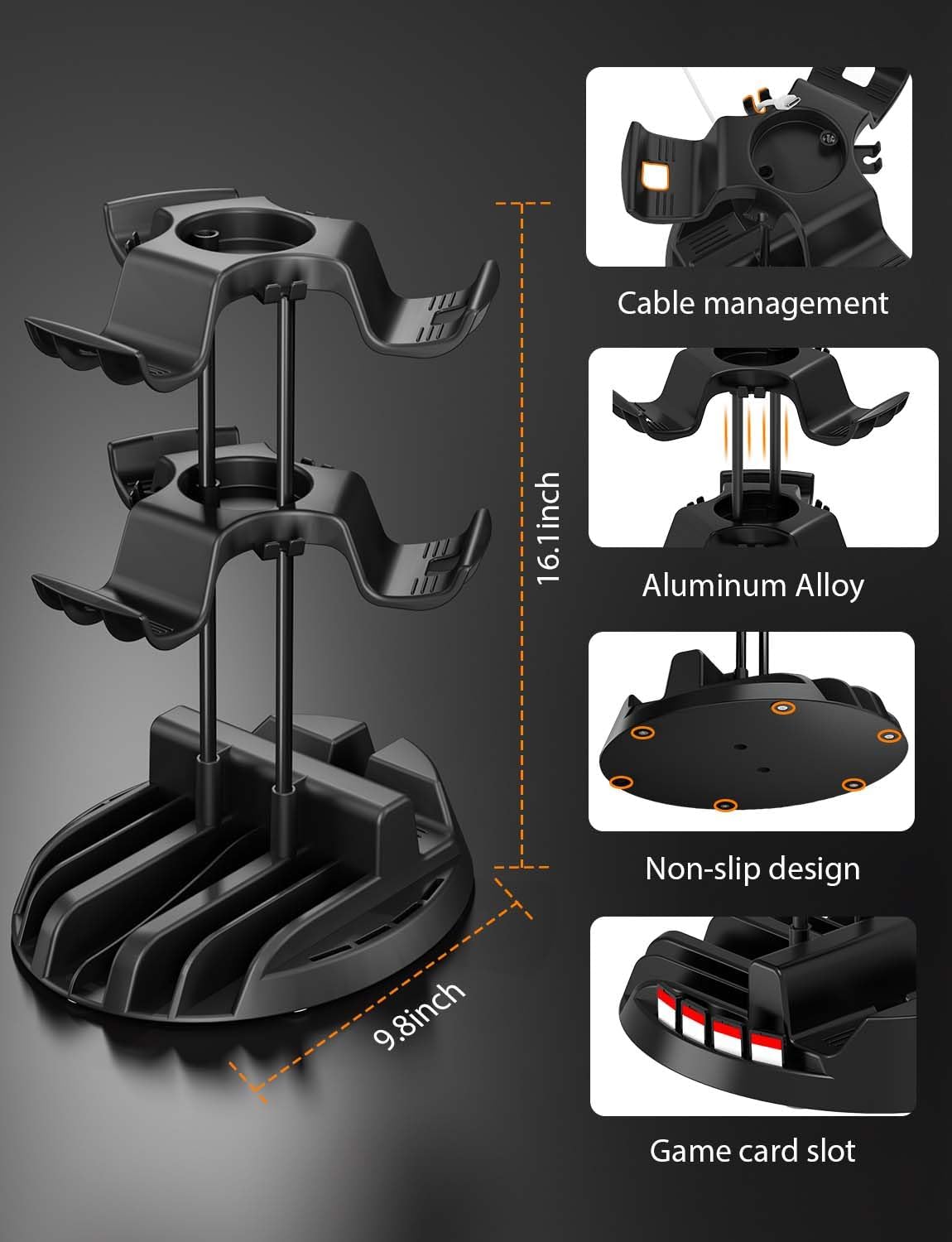 More Organization Space: This 2-tier controller stand with organizer base saves more space. This game controller stand can hold 6 controllers or 3 headsets, game console, 6 game discs and 8 game cards, cables can be stored on both sides, keeping your gaming space tidy and organized.
