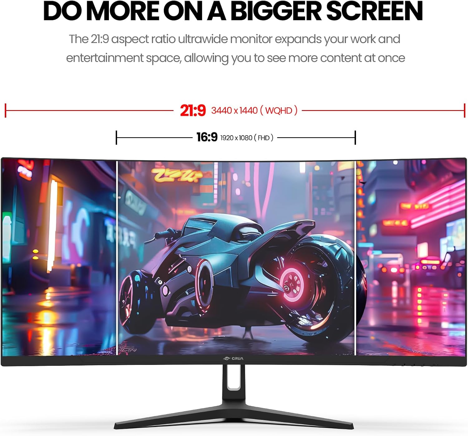 Ultra-Wide Monitor: CRUA 34-inch (3440×1440P) monitor with 21:9 1500R layout fills your field of view and delivers more realistic images and comfortable viewing. The 34-inch gaming monitor with 99% sRGB wide color gamut, 300 cd/m² brightness, and 4000:1 contrast allows you to enjoy the beauty of 16.7 million colors on the big screen for more accurate and realistic color gradients.