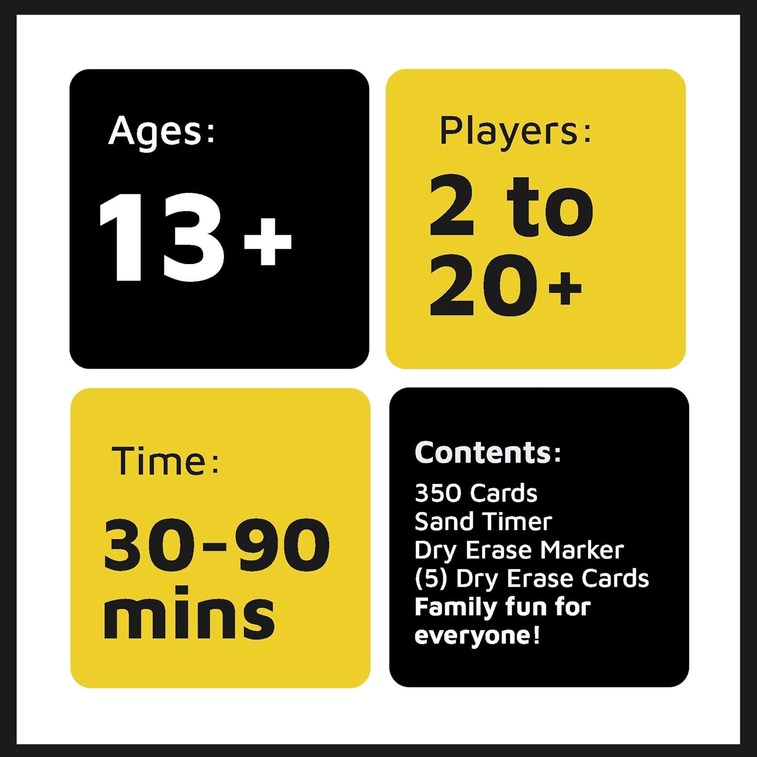 IN THE BOX: 350 cards, sand timer, dry erase marker, 5 blank DIY cards, and unlimited fun for everyone in seven categories: Black Twitter, Church, Daily Sayings, Family & Friends, Songs & Lyrics, TV & movies, and words to live by