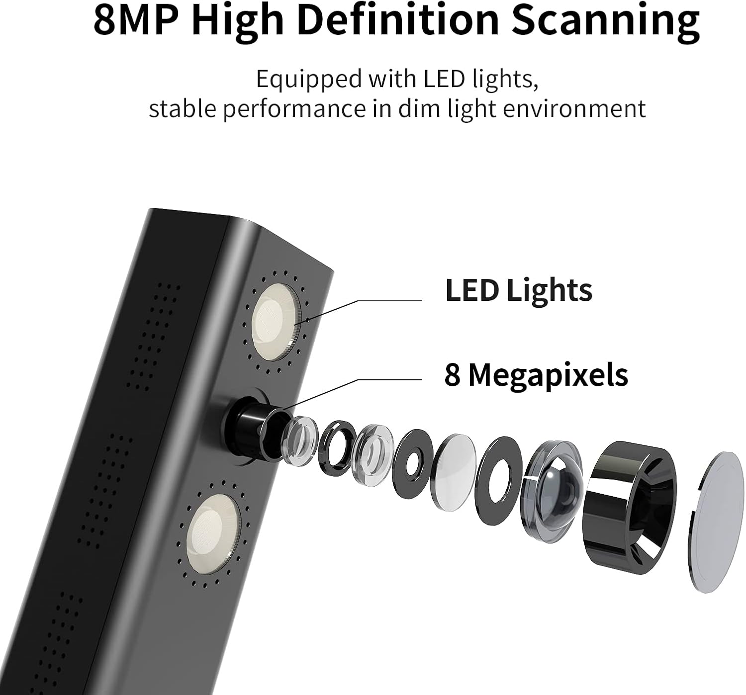 Excellent performance: Includes an 8MP camera (resolution: 3264*2448) and LED lights with adjustable brightness. Shine800 has a variety of useful functions such as OCR, automatic tilt correction, front and back combination, etc. Notice: Glossy materials are NOT recommended (glossy photos, glossy magazines)