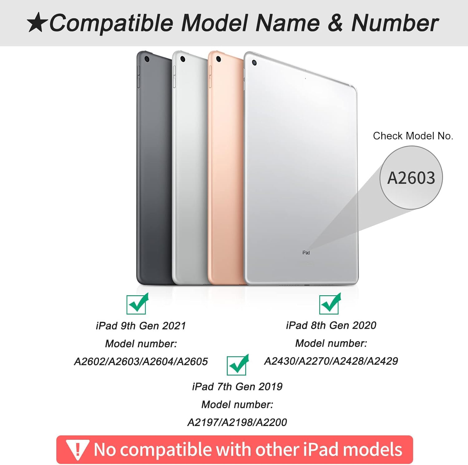 Universal Keyboard Case for iPad 9th/8th/7th Generation 10.2 inch. Exclusively designed for iPad 9th Generation 2021, iPad 8th Generation 2020, iPad 7th Generation 2019 10.2 inch. Compatible iPad Model Number: A2602/A2603/A2604/A2605, A2270/A2428/A2429/A2430, A2197/A2200/A2198. Please check the model number starting with “A” on the back of your iPad before purchasing.