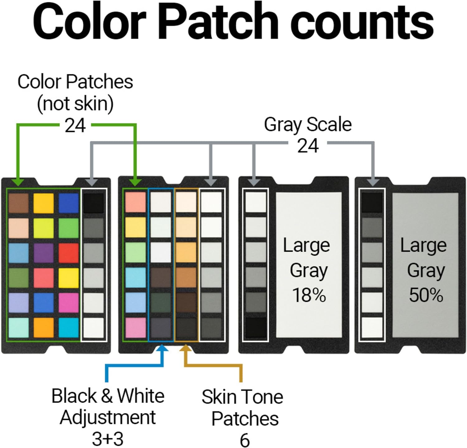 : The complete collection of color targets includes 62 colors: 24 shades + 6 skin tones; 24 gray scales; 2 large gray scales; 3 white settings and 3 black settings.