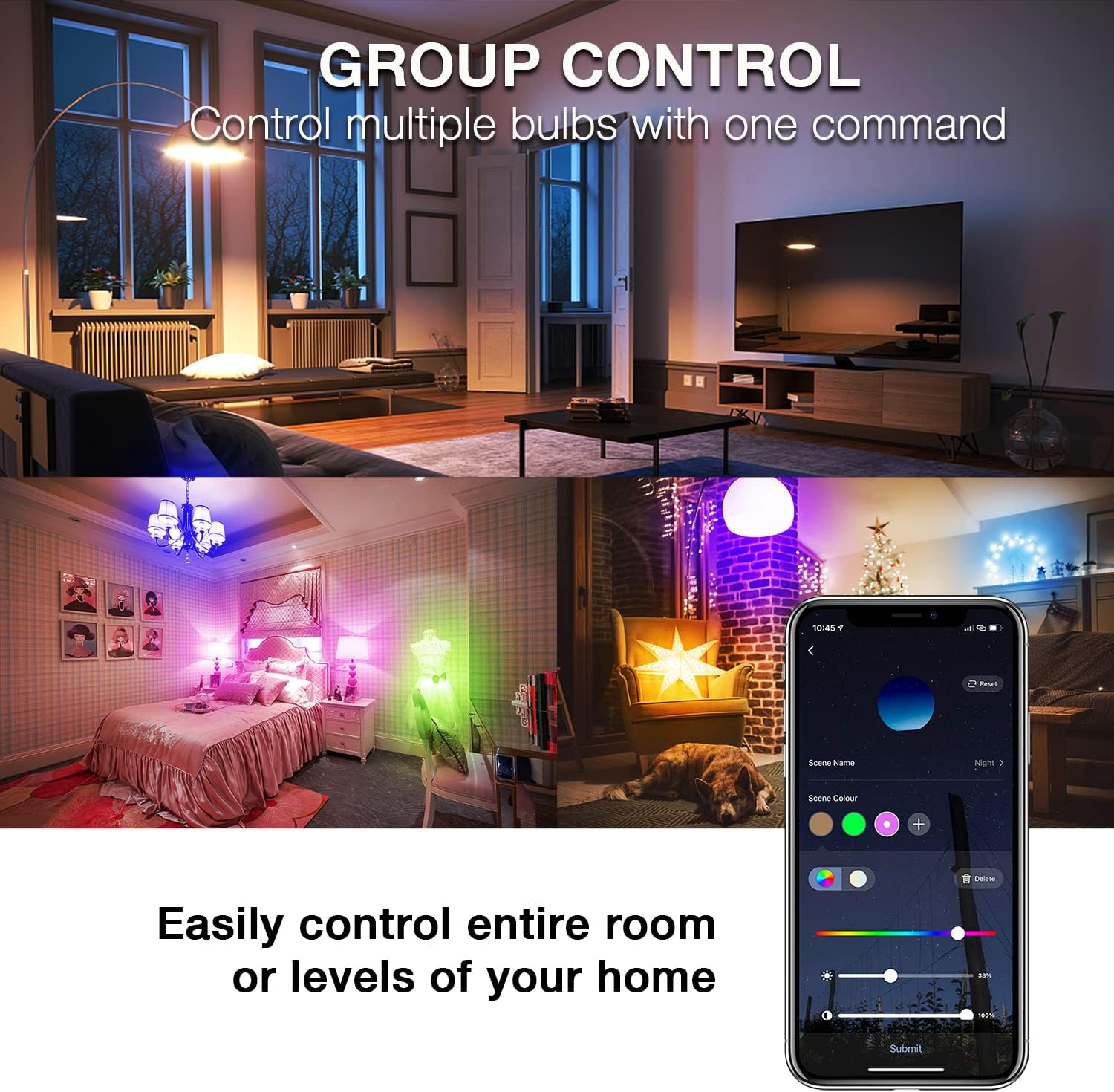 Group Control: Use the app's grouping feature to control multiple bulbs, then activate them according to the bulb group label you want to turn on; Use 16 million bright and soft colors plus adjustable whites to create the perfect ambiance; Ideal for parties, entertaining, and everyday use