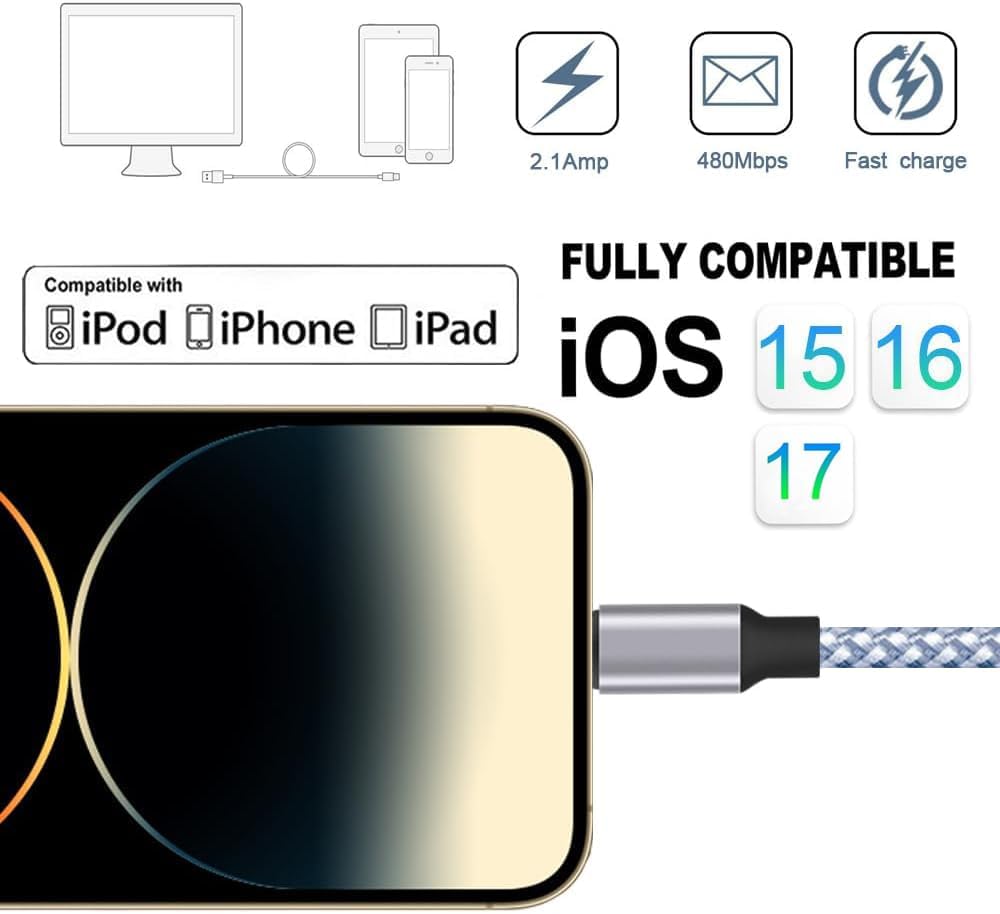 High-quality copper cables can maximize signal quality and increase durability. Quickly sync and charge on your device. Our technical team has performed thousands of tests to ensure the safety of the durable 8-pin high-speed braided USB charge and sync cable.