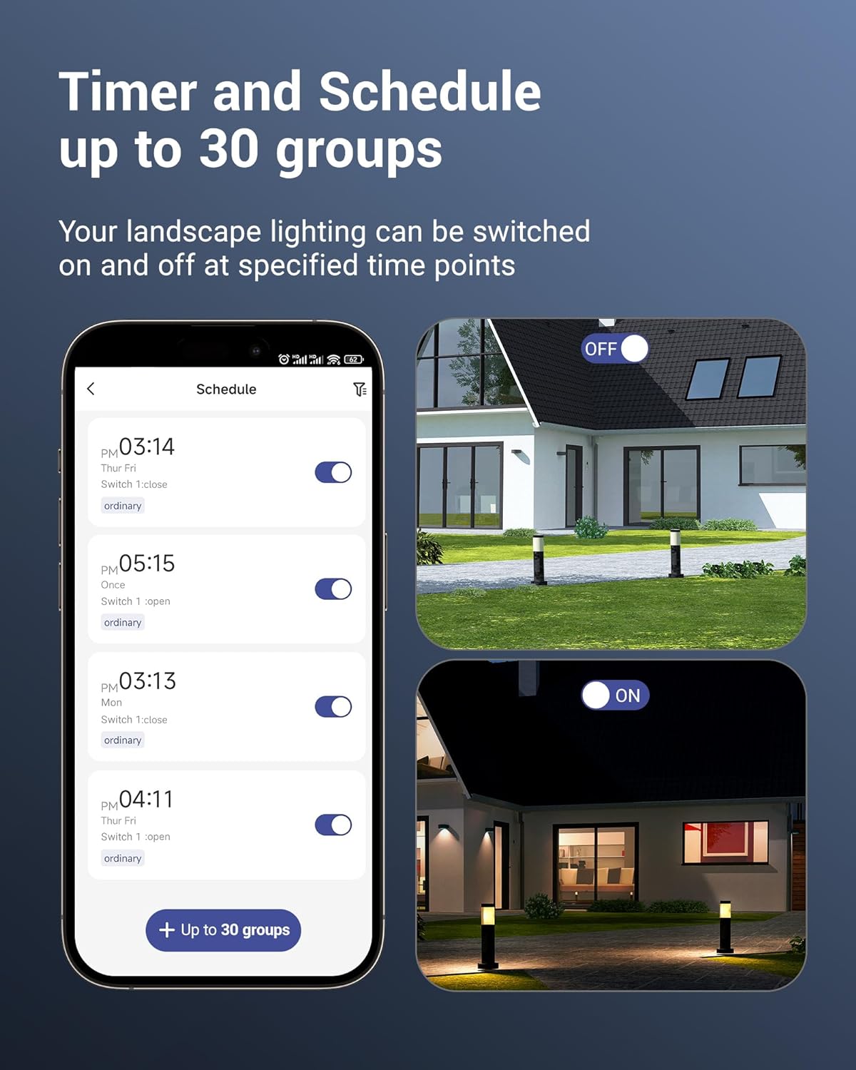 [Wide Application] Compatible with all 12V low voltage LED, halogen landscape lighting, such as spotlights, path lights, garden lights, patio lights, water fountains, etc.; Connect wifi outdoor low voltage transformers via DEWENWILS app, then enjoy the pleasant and convenient use