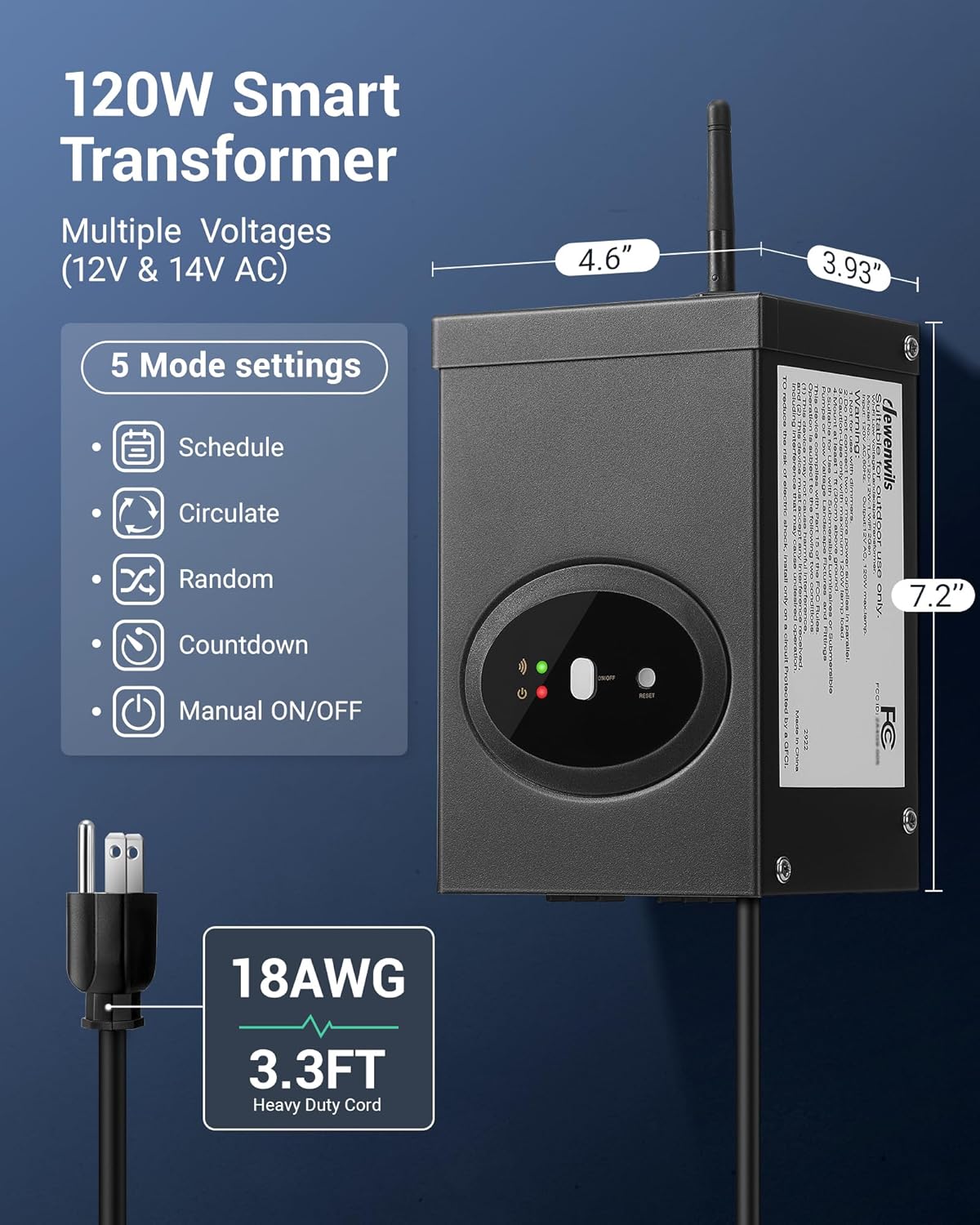 [Schedule & Timer Function] This low voltage smart transformer allows you to spend the holidays more safely and reliably in Vacation mode; there are also 5 timer modes available: Programmable Timer / Countdown Timer / Holiday Random Modes / Safety Random Modes / Circulation Mode; converts 120V AC to 12V AC safety voltage