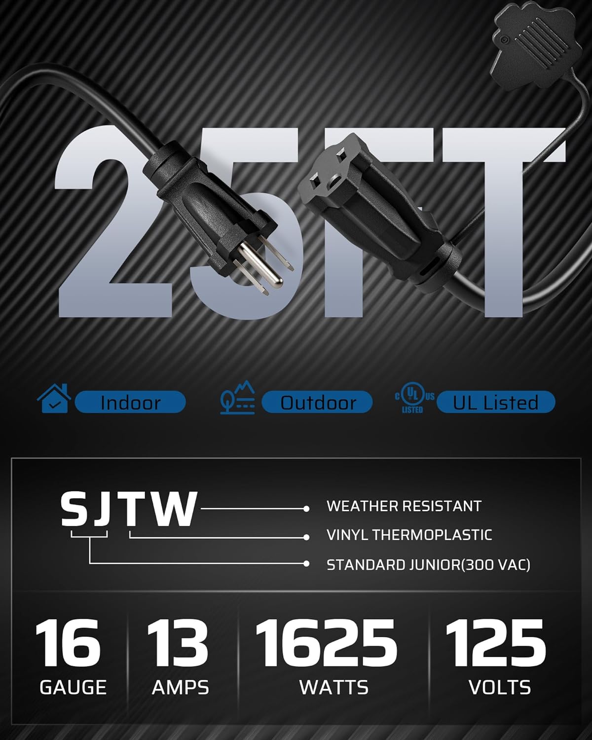 【Heavy Duty Extension Cord】Made of double-coated copper wire and reinforced blades, protect the tips from bending or breaking; The 16/3C SJTW power cable extension allows you to power multiple appliances at the same time; Be careful not to exceed the rated power 13A 125V 1625W