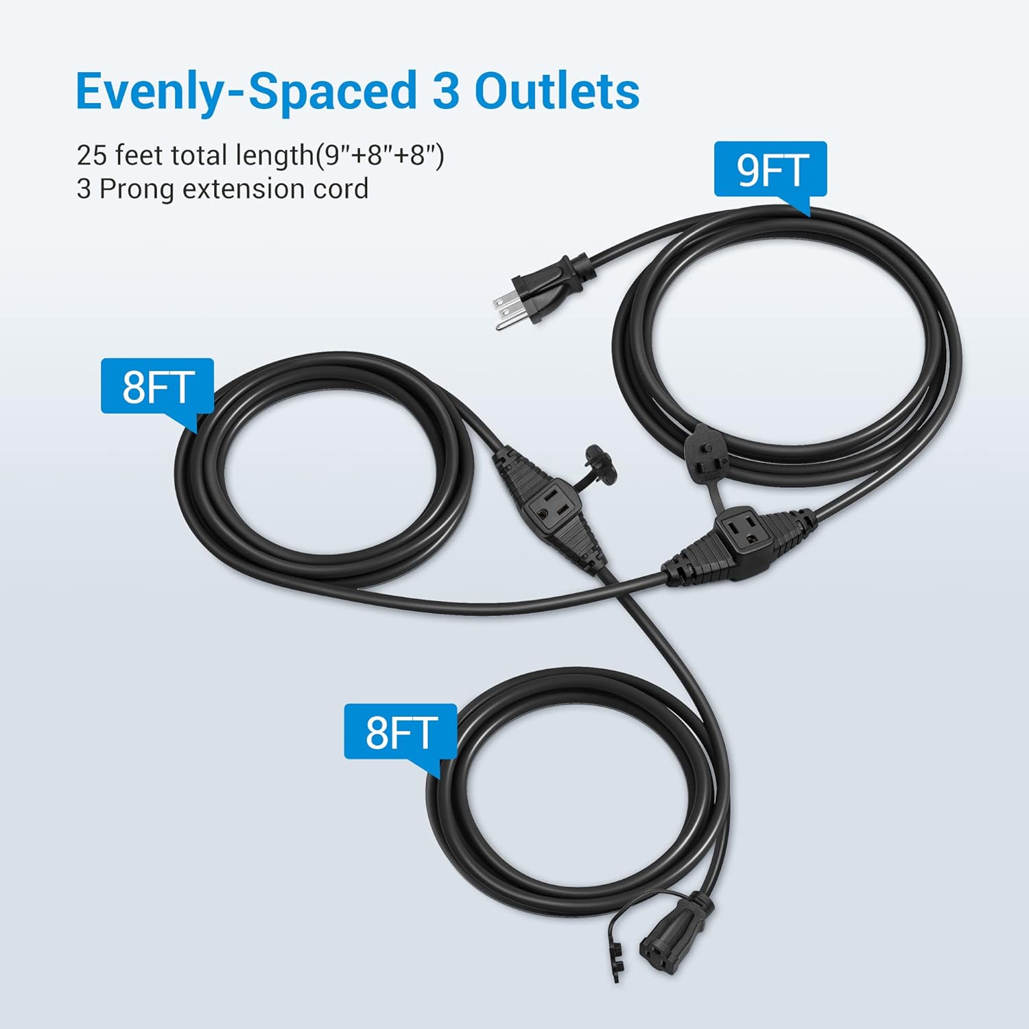 【3 Evenly Spaced Outlets】25 feet total length; the plug to the first outlet with a cord length of 9 feet, evenly spaced 8 feet from the remaining two outlets; The 3 prong extension cord is ideal for installing landscape lighting and Christmas decorations with fewer cables, keeps your garden organized and tidy.
