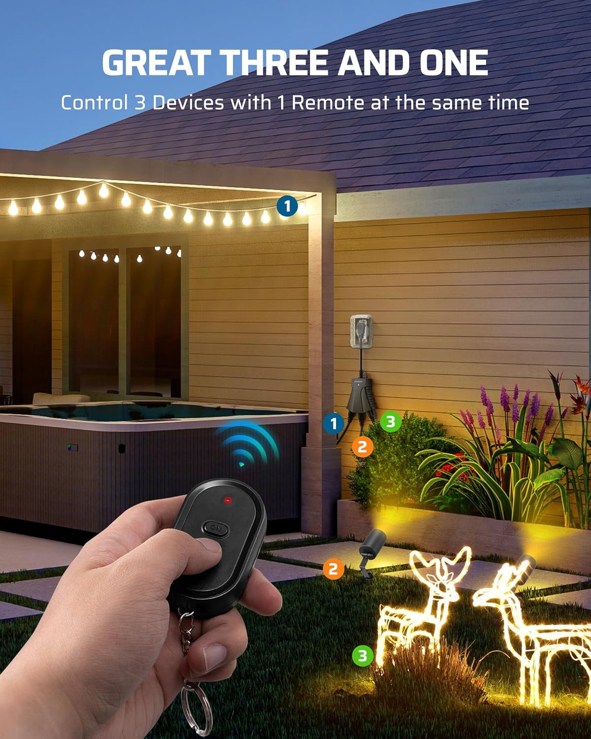 【Remote control output switch】 Turn on the patio lights, rope lights, sources, sprinklers, lighting accessories and other appliances with a button with a button from the house inside; Remote and exterior plug/off switch for interior and exterior use