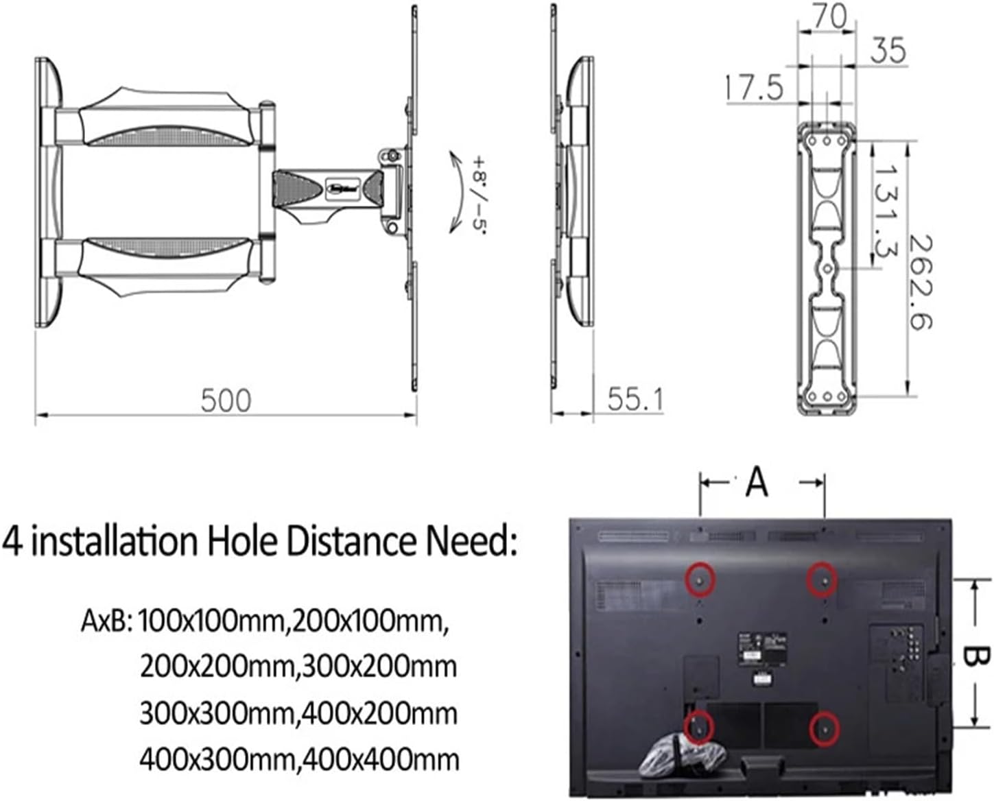 Monitor MountsModel: P4Material: SPCC cold rolled steelScreen size: 32 inch – 55 inchTilt: -5 +85Rotation: -90 +90Max. Load: 70 lbs (31.8 kg) Distance to wall: 51.5-500 mm